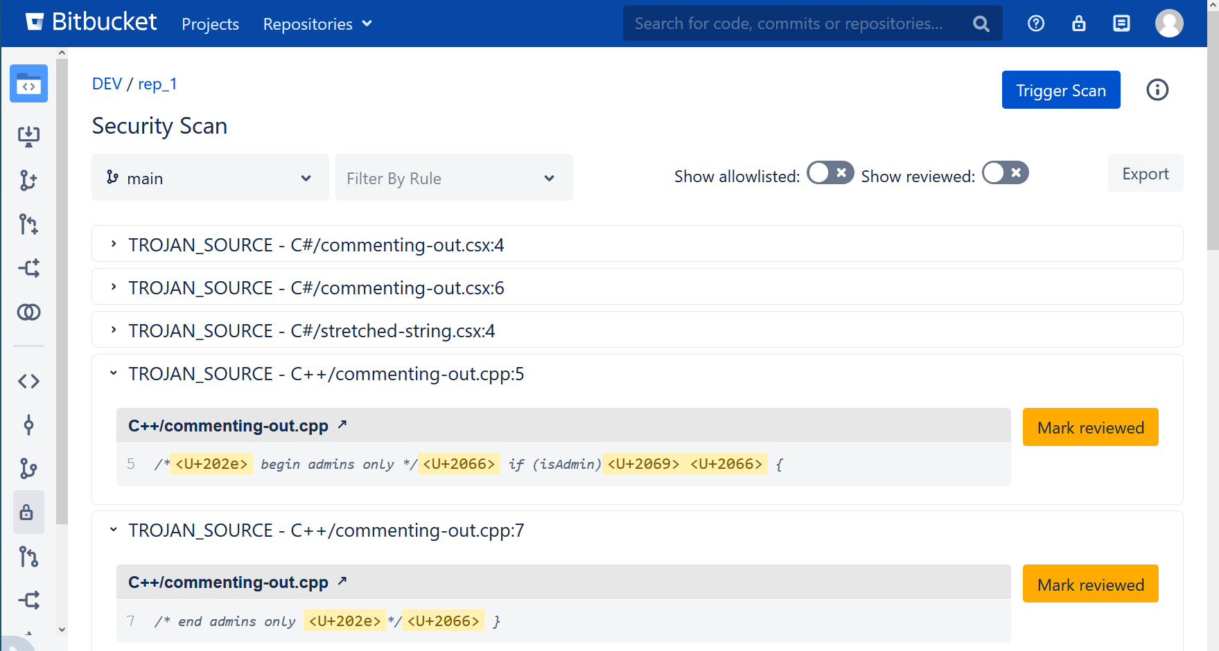 TROJAN_SOURCErule. It is enabled by default. Version 3.9.0 or greater also displays unicode bidirectional override characters in the Security Scan Report.Run a total instance re-scan, using the