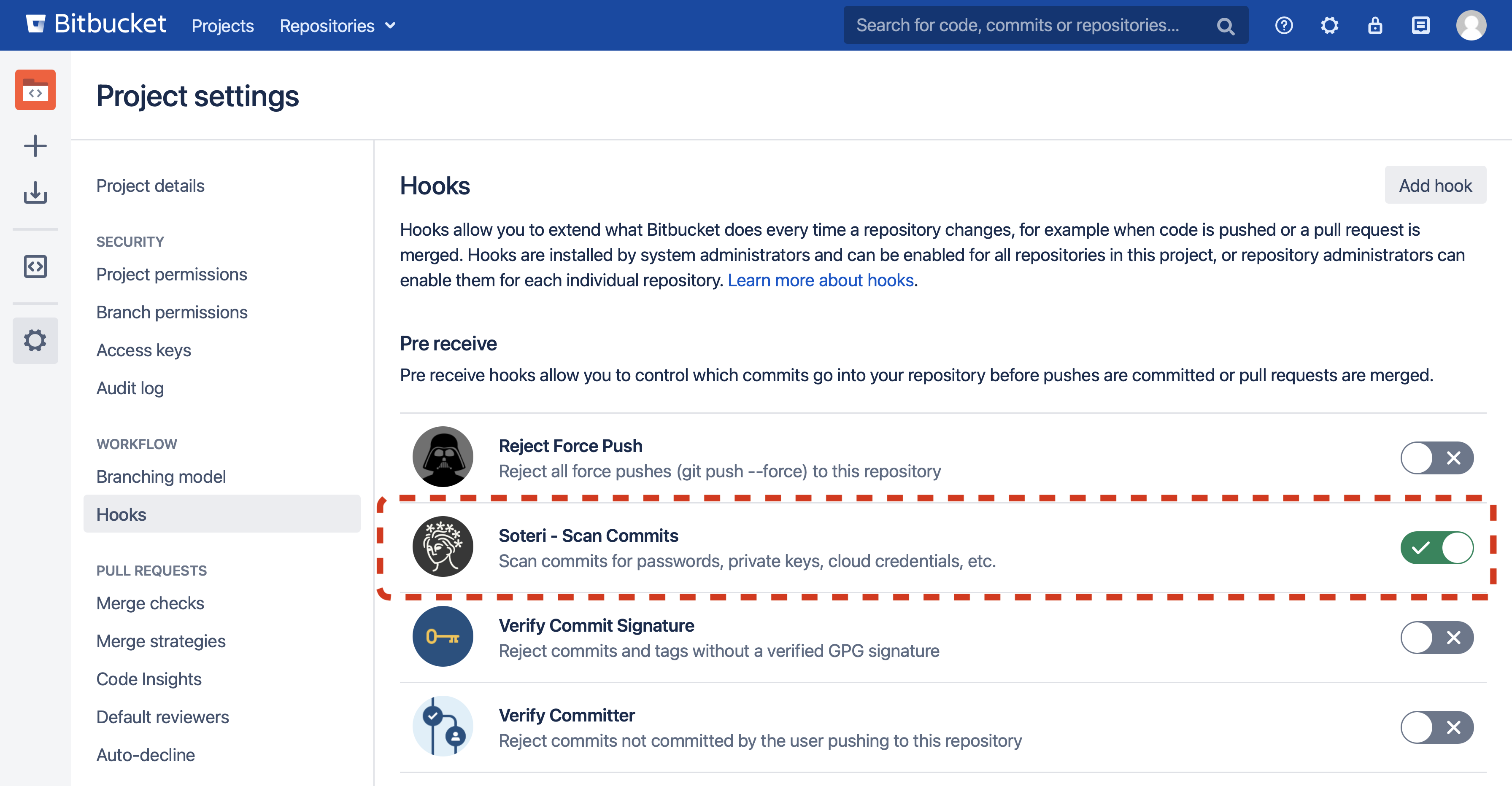 To enable the hook on a repository level, go to the desired repository, Settings → Hooks, and then enable the Soteri - Scan Commits hook. A pop-up will prompt you with the option whether to configure the hook in reject or warn-only mode.