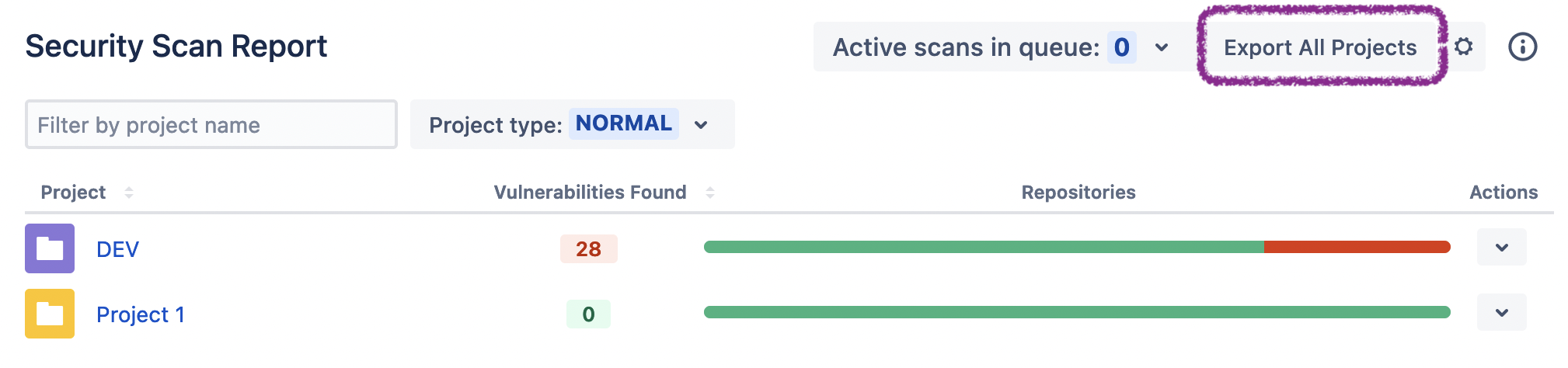 Additionally, if you need to export all vulnerabilities for all projects, repositories, and branches into a single file, from the global Security Scan Report page, you may click the “Export All Projects” button as shown below.