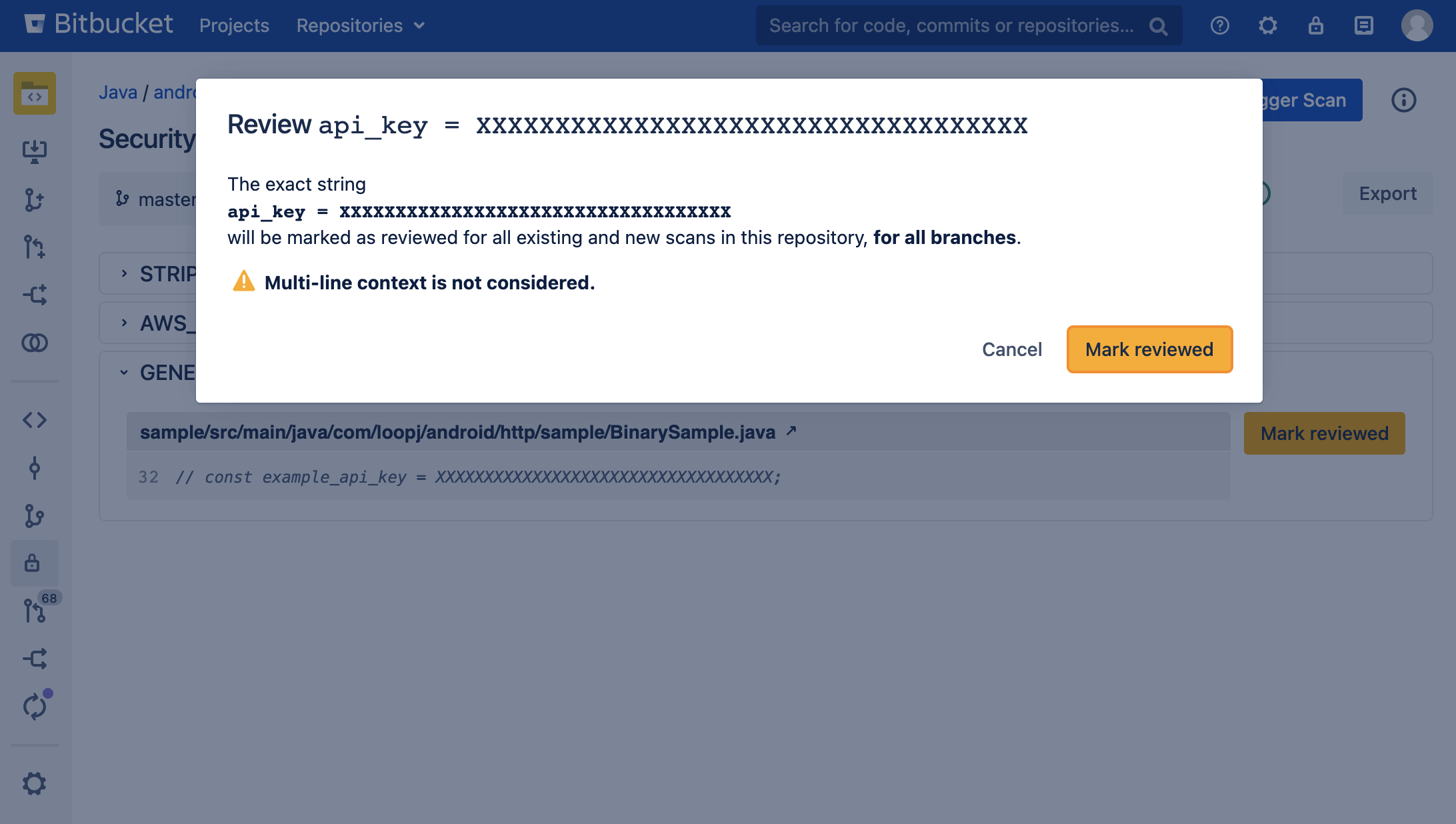Sometimes, Security for Bitbucket will find vulnerabilities which are false positives, credentials which have already been revoked, etc. If this happens, you can review the finding. This marks the finding, as well as any other findings which exactly match it, as reviewed in the current and future scans. This feature is available from the Repository-level Scan Report.