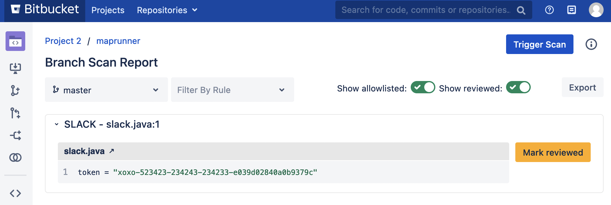 will start the scan, or if Bitbucket already has multiple scans ongoing, this will schedule the scan. Results will start to populate as the app finds vulnerabilities in files within the branch: