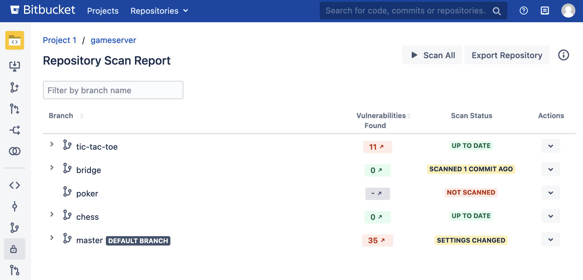 The Security Scan Report provides a central security dashboard for Bitbucket administrators as well as any user who's been granted explicit access. Additionally, Security for Bitbucket provides to repository writers (e.g., developers) a dashboard with similar functionality so that they may perform scans and obtain vulnerability reports for any branches in their own repositories.