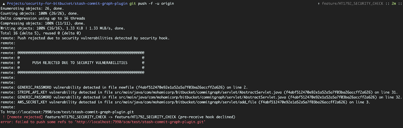 Security for Bitbucket contains a pre-receive hook, which can run a scan on any code before it is pushed into Bitbucket. At the Bitbucket instance level, the Security Hook can be configured to run: