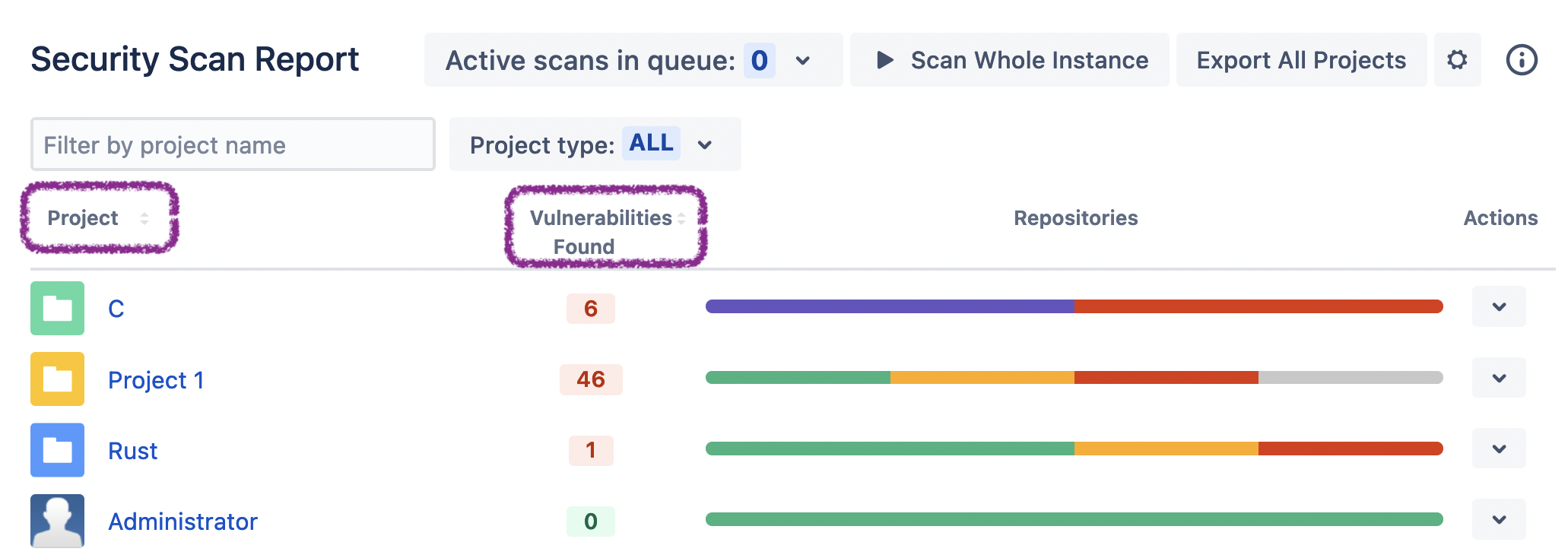 In each of the top level, project level, and repository level scan reports, the rows can be sorted both by name (in the normal alphabetic order) and by the number of vulnerabilities found (from most to least).