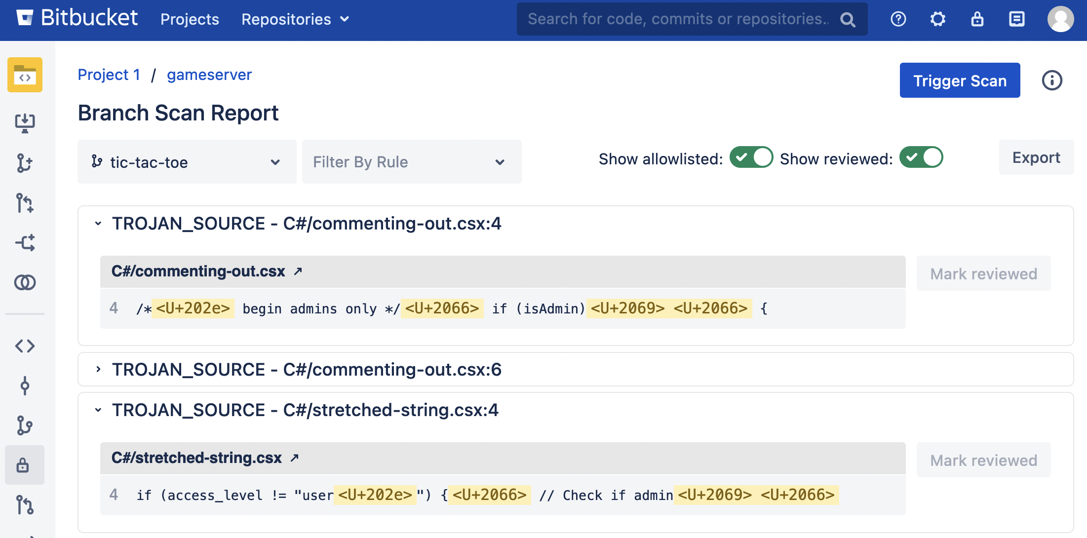 TROJAN_SOURCErule. It is enabled by default. Version 3.9.0 or greater also displays unicode bidirectional override characters in the Security Scan Report.Run a total instance re-scan, using the
