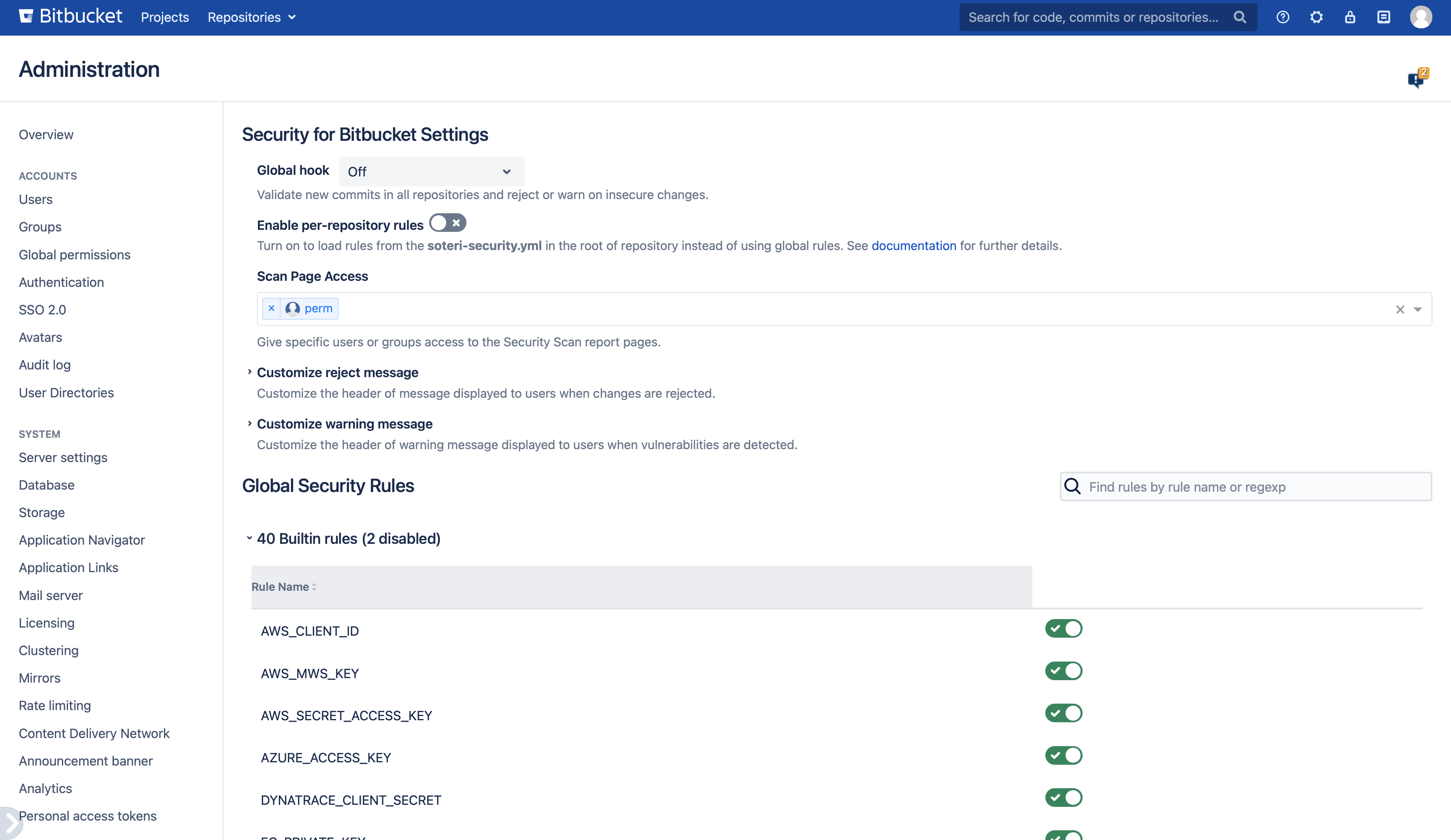 With Security for Bitbucket you can disable security rules if a certain rule doesn’t fit the needs of your organization. The rules can only be enabled and disabled by Bitbucket administrators or anyone that's been granted explicit access.