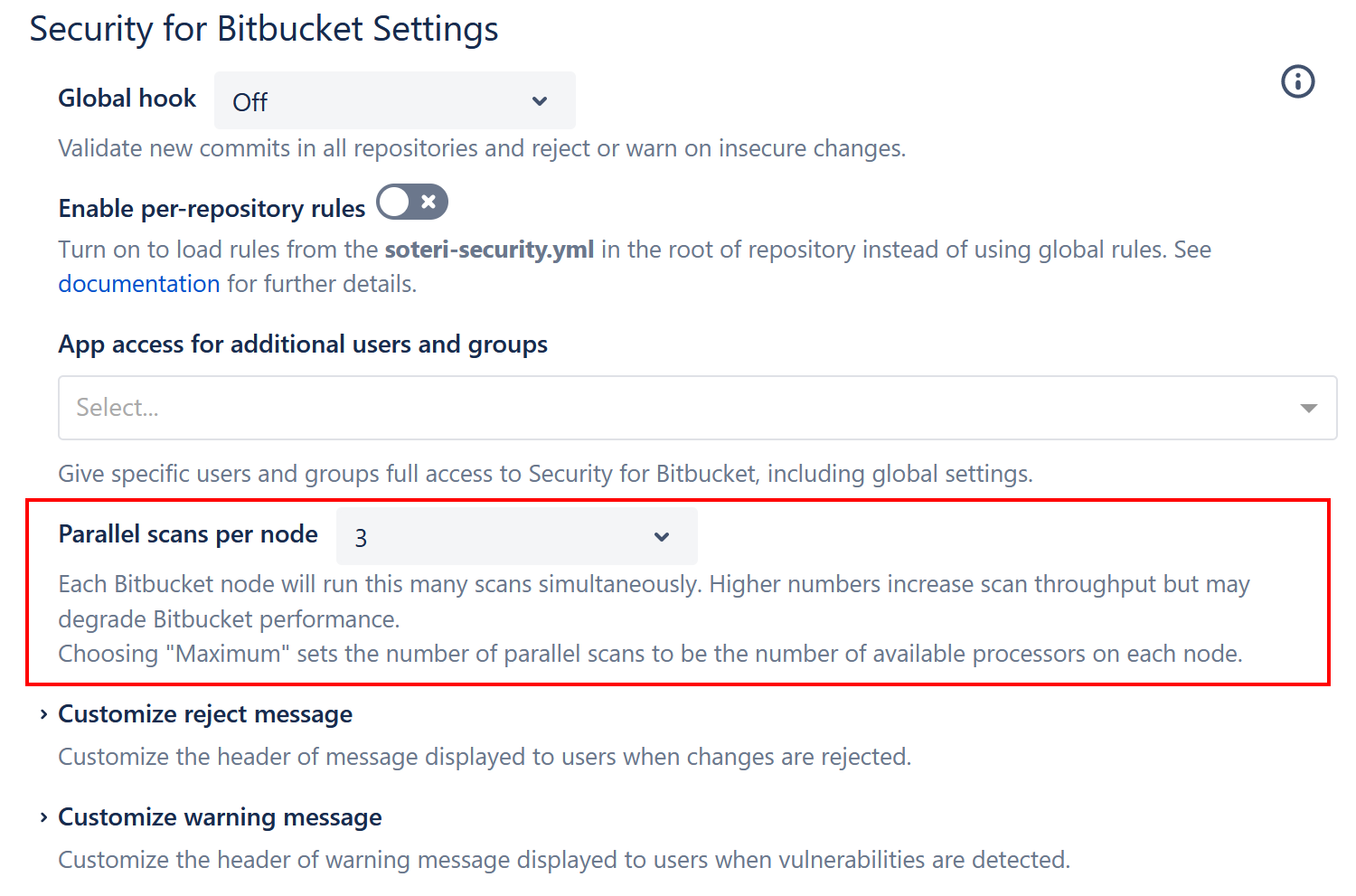 To speed up scanning, you can change the number of parallel threads used by Security for Bitbucket during scans via the settings page. Select the desired number of parallel scans per node in the corresponding drop-down box: