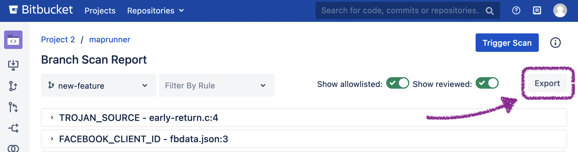 Export All Scan Results can put a strain on Bitbucket resources if there are a lot of results. Consequently, a dialog box will pop up to confirm that you wish to perform this action.