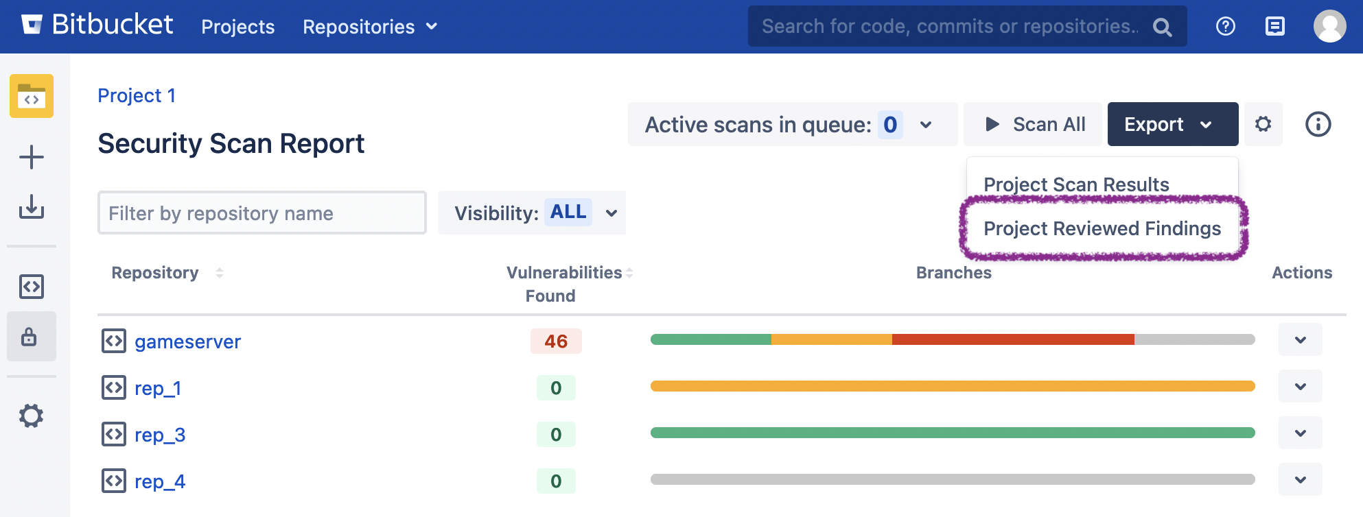 Reviewed findings can be exported to a csv file by selecting the appropriate option in the Export dropdown in the upper-right of the Global, Project-level, and Repository-level dashboards.