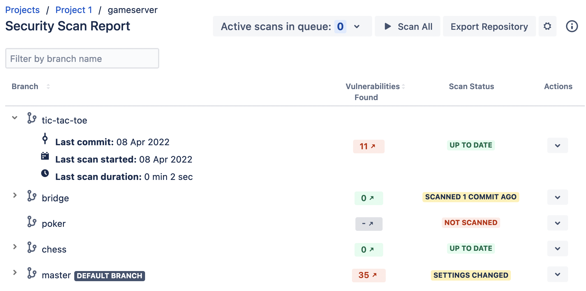 By clicking on a scan link (displayed in the format ProjectName / RepositoryName : BranchName), you can open its Branch Scan Report.