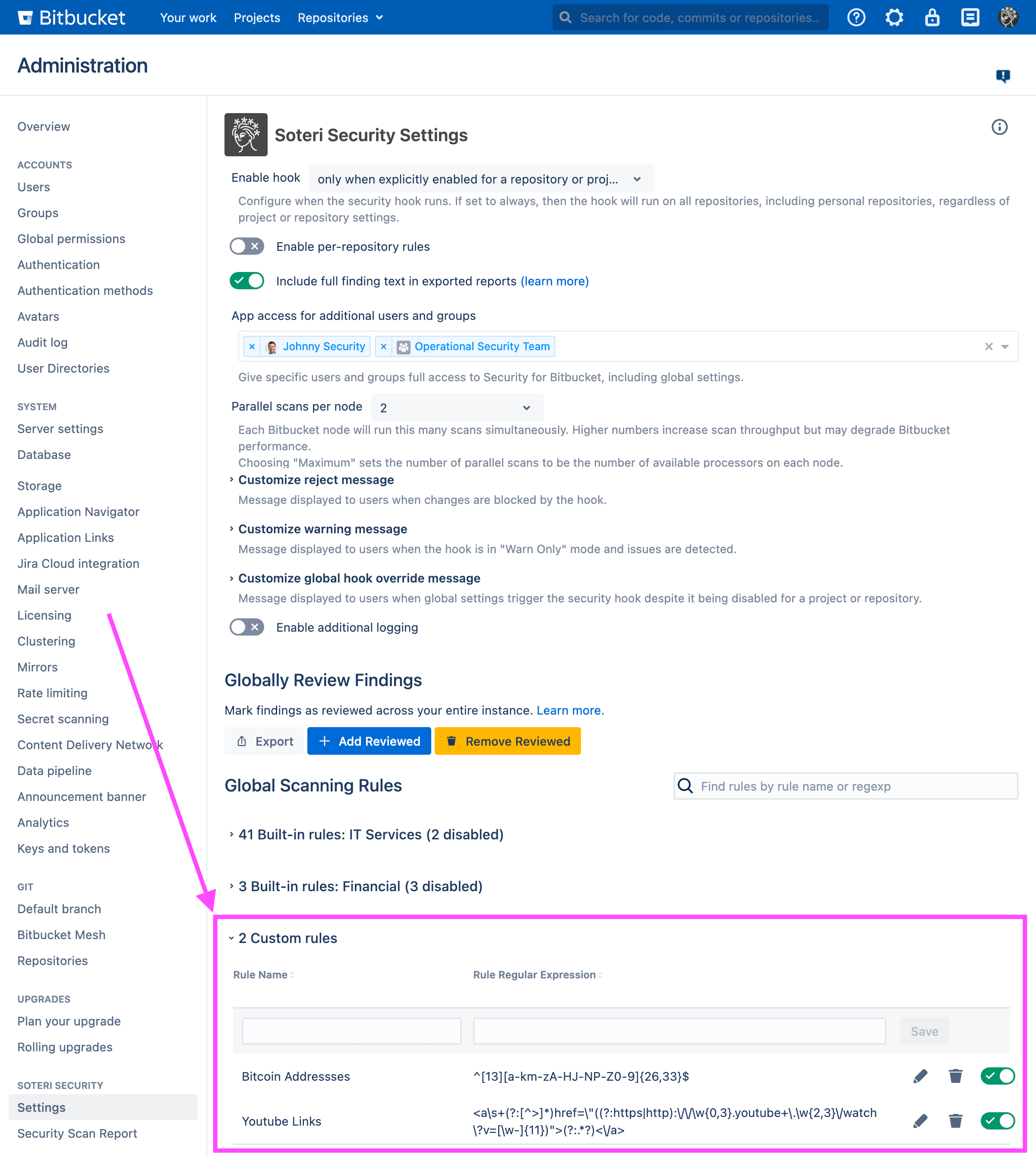 Security for Bitbucket allows for creation of custom scanning rules using regular expressions. The rules can only be created, enabled, or disabled by Bitbucket Administrators or anyone that's been granted explicit access.