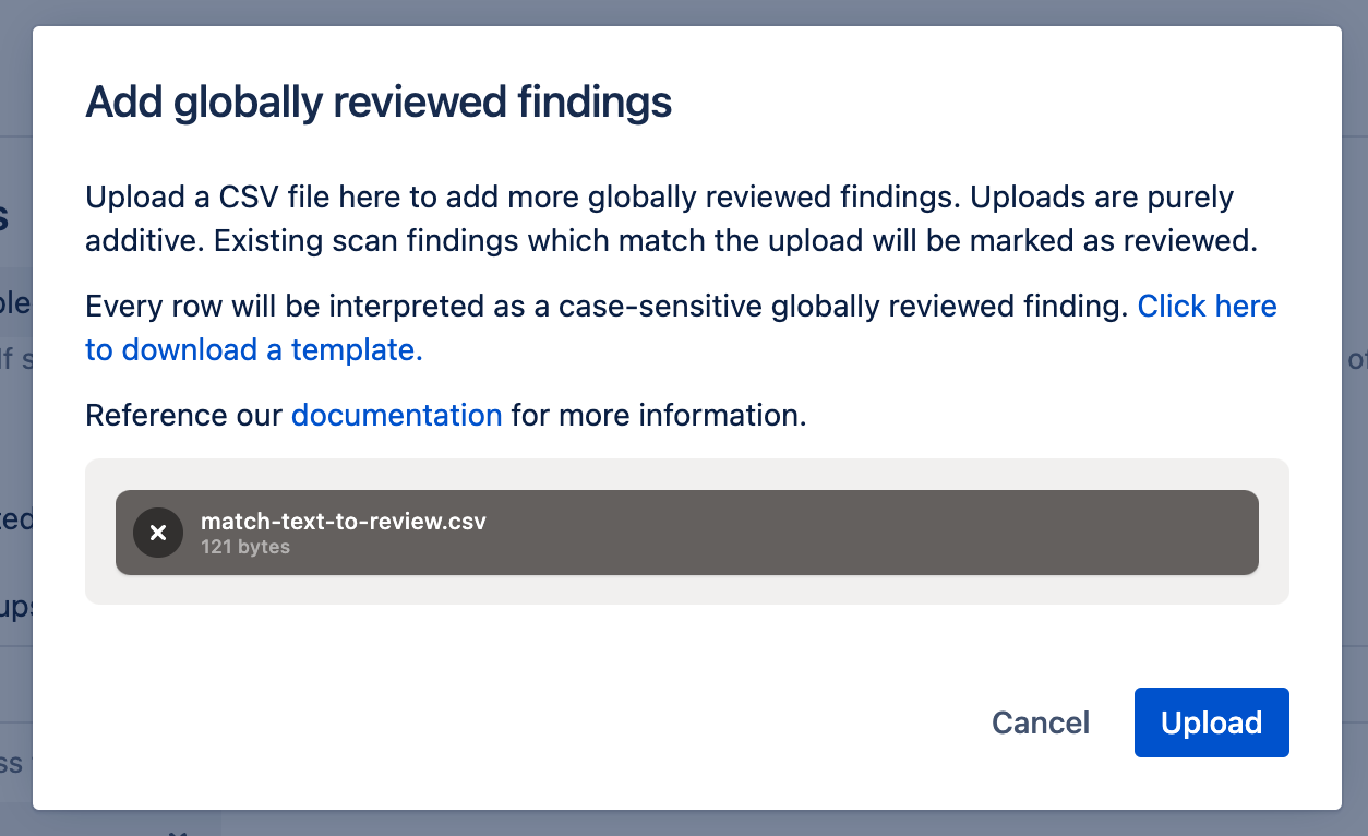 Upload it on the settings page using the “Add reviewed” button under the “Globally Review Findings” heading.