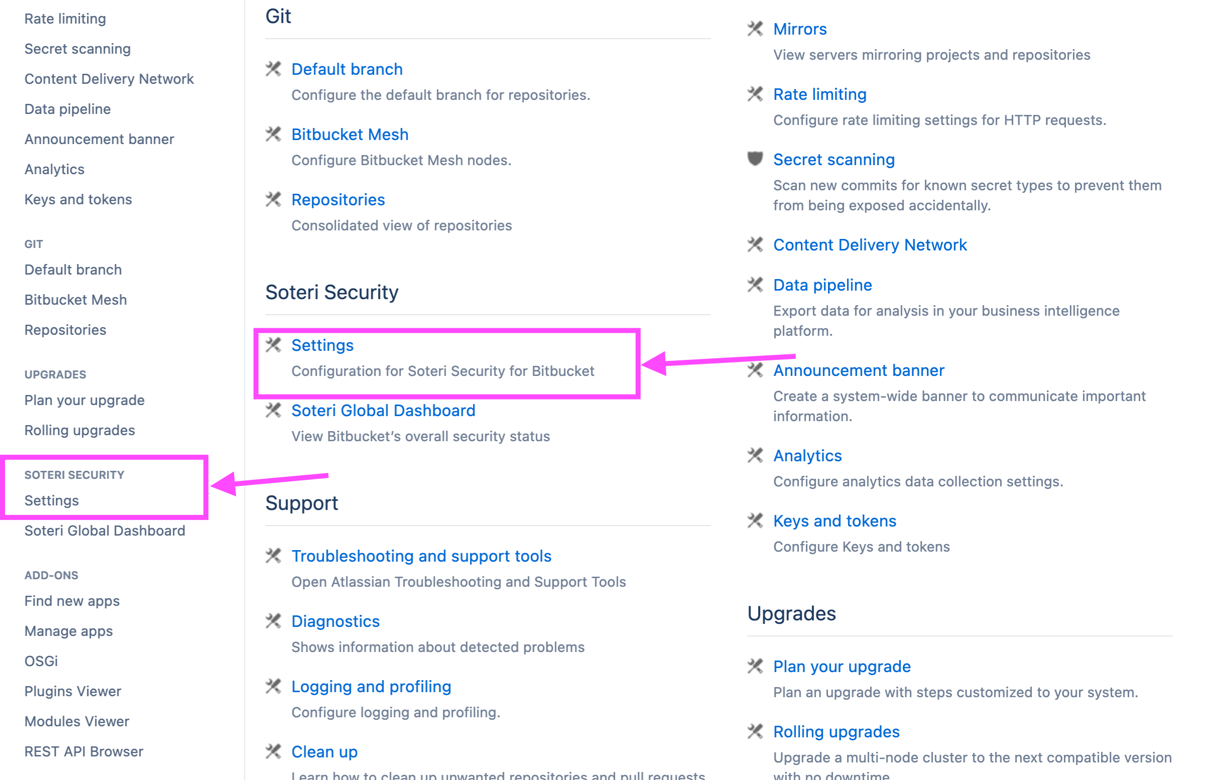 Bitbucket administrators will see a “Soteri Security” section in their Bitbucket settings, can can click on the “Setting” link there: