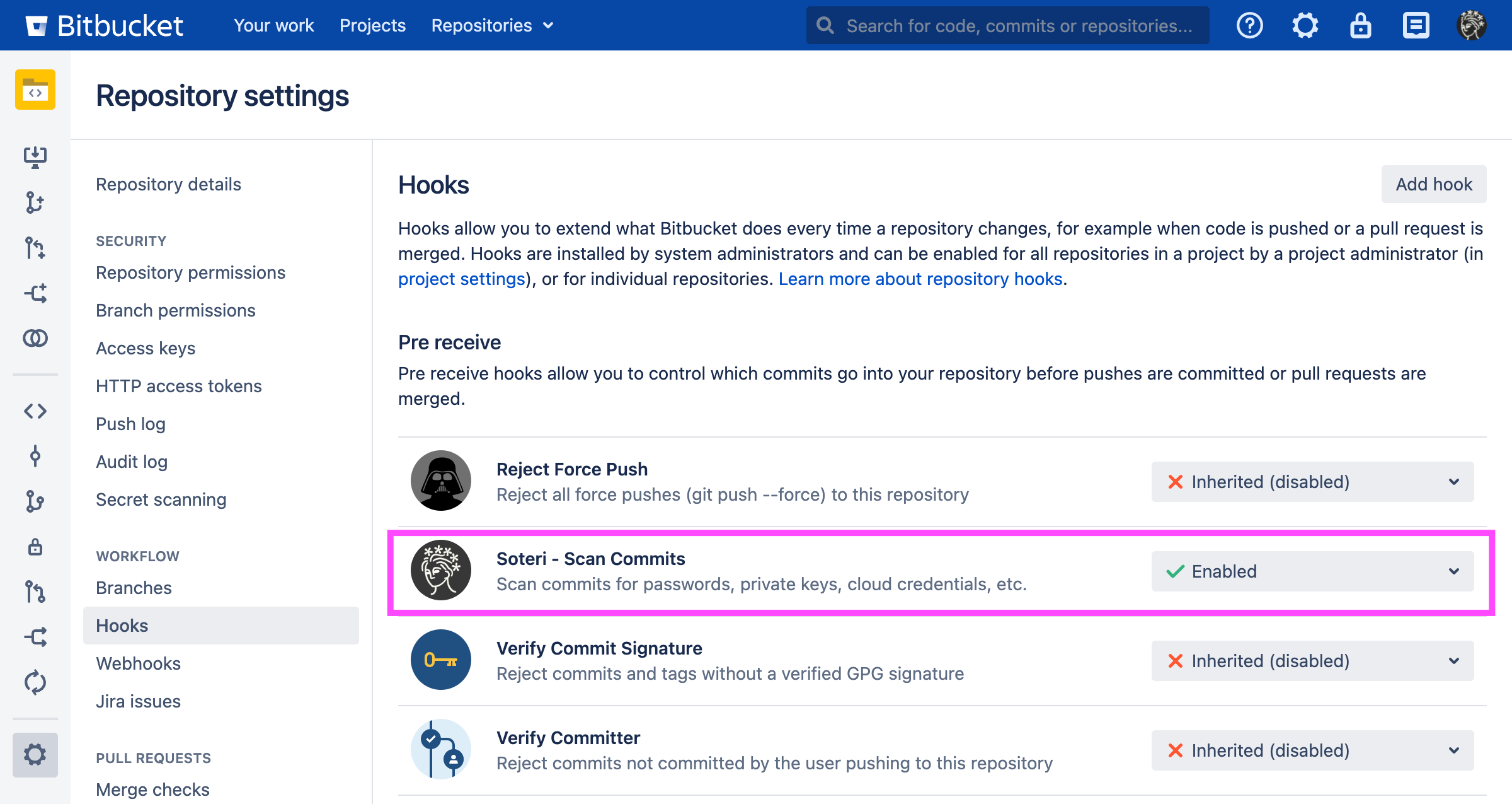 To enable the hook on a repository level, go to the desired repository, Settings → Hooks, and then enable the Soteri - Scan Commits hook. A pop-up will prompt you with the option whether to configure the hook in reject or warn-only mode. If you want to change the hook configuration (reject or warn-only mode), disable, then re-enable the hook to get the pop-up to re-appear.