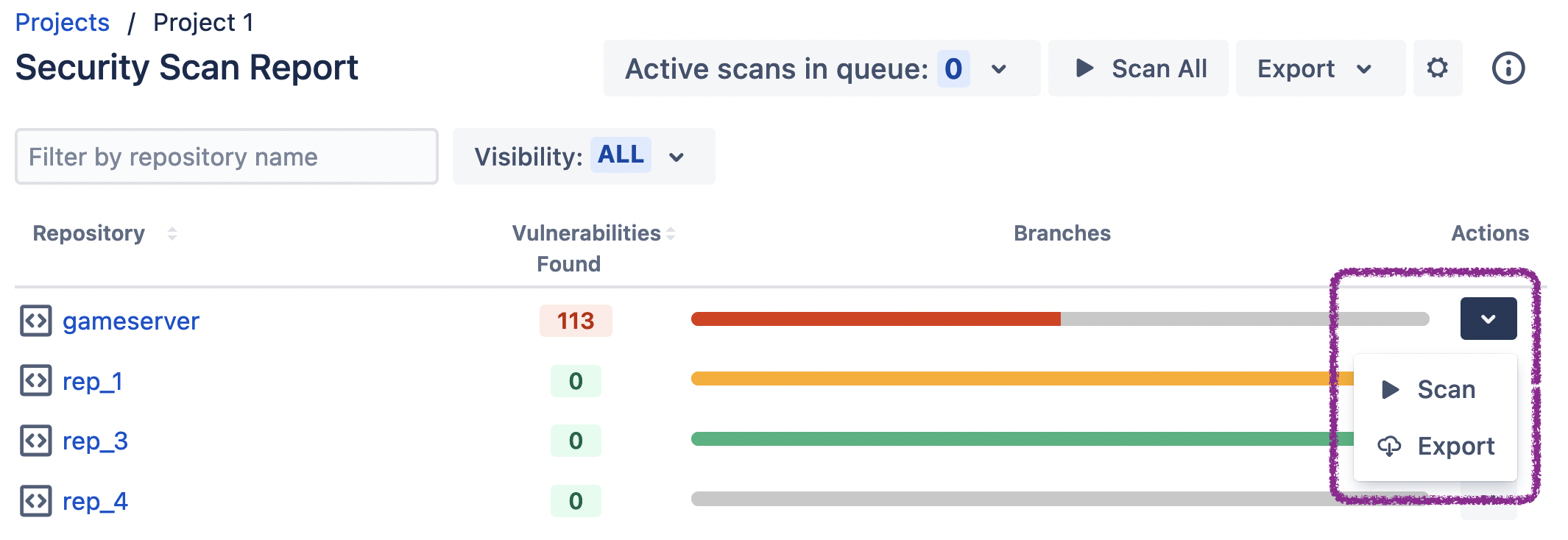 At the Project level, you can use the Scan All button to trigger scans for each repository in that project. If you’ve filtered the repositories via the Visibility dropdown and/or by name, this button will change to Scan Selected, which will trigger scans for only those repositories matching the criteria.