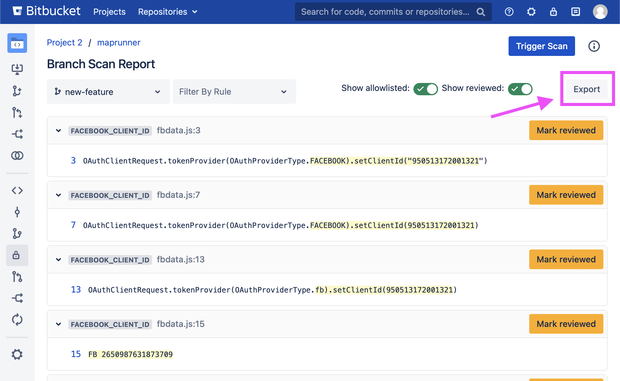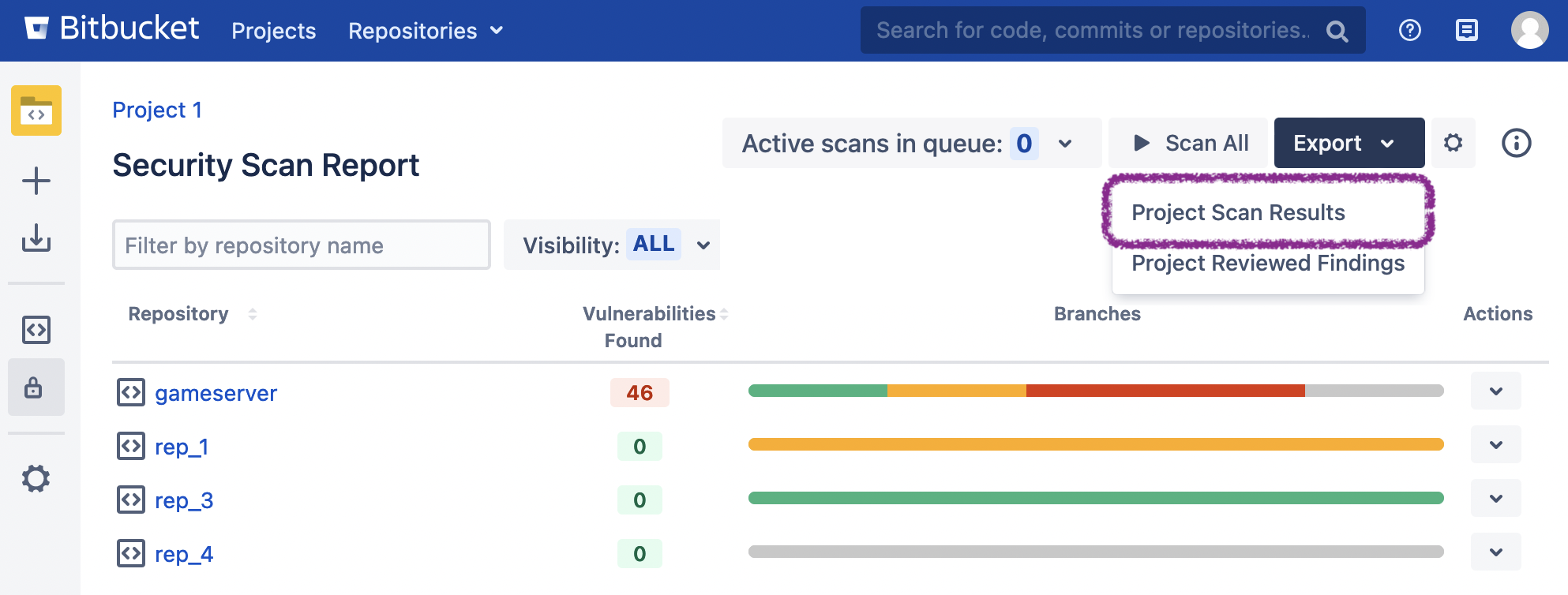 You may also use various REST calls to export vulnerabilities of any given branch, repository, project, or the whole Bitbucket instance.