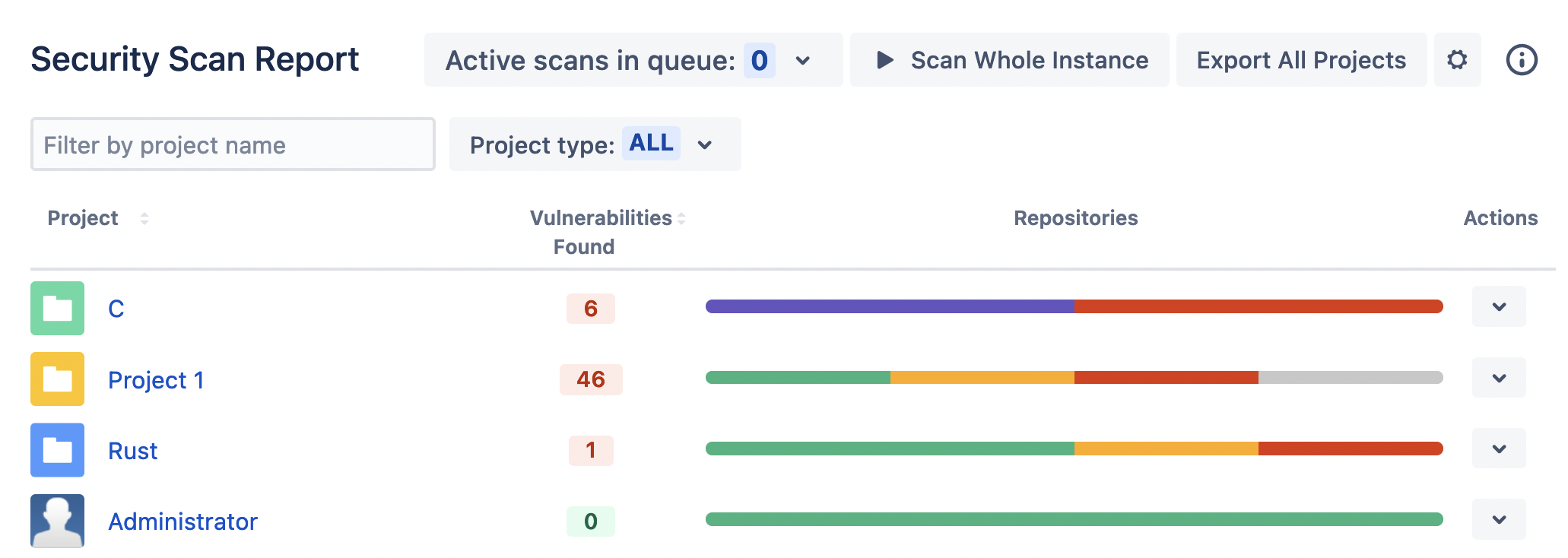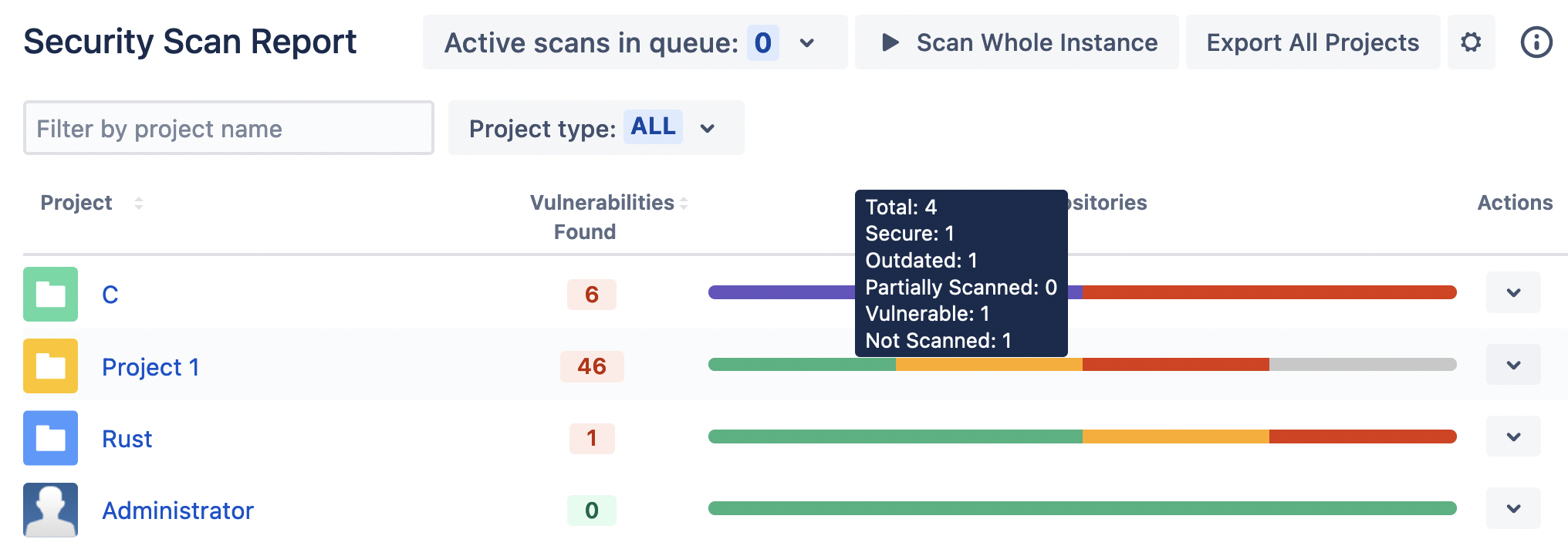 At the Project level, you can use the Scan All button to trigger scans for each repository in that project. If you’ve filtered the repositories via the Visibility dropdown and/or by name, this button will change to Scan Selected, which will trigger scans for only those repositories matching the criteria.