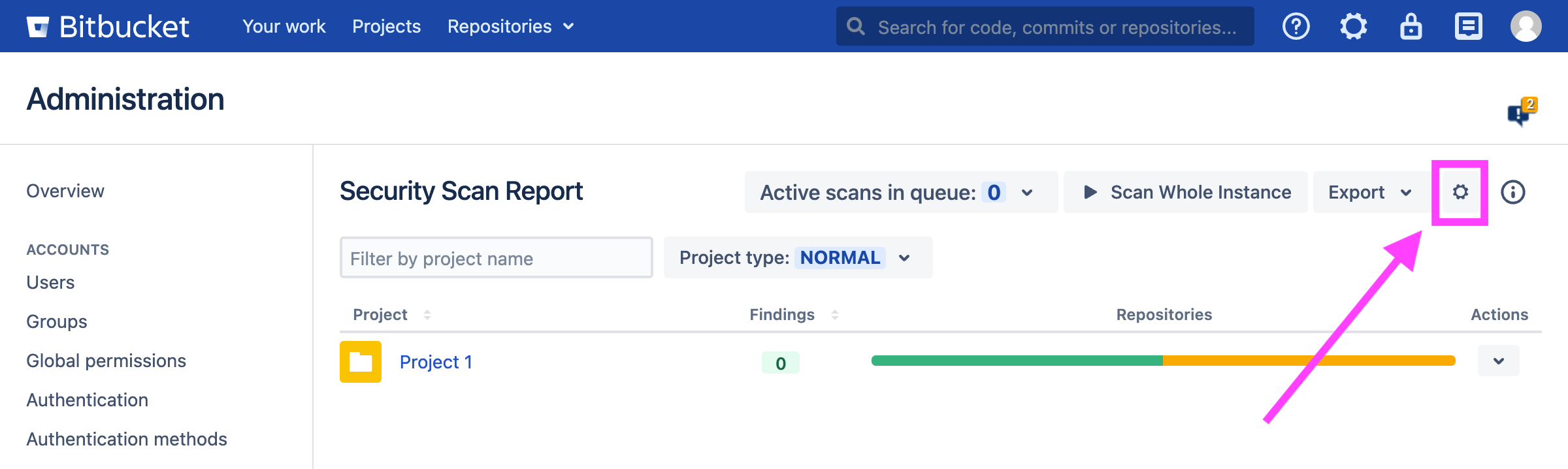 To disable a rule, go to Administration → Security for Bitbucket Server → Security Validation Rules → Custom Rules. Alternatively, you may reach the configuration by clicking the gear icon on any dashboard: