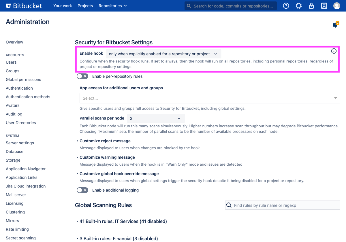 To enable the hook on a global scale, Bitbucket administrator, or anyone granted access to Security for Bitbucket, can go to Administration → Security for Bitbucket Settings and then modify the Enable hook drop-down option: