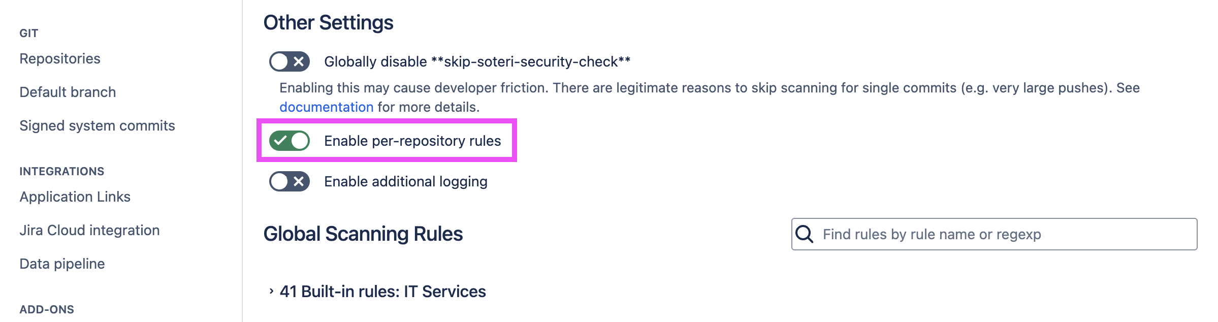 Per-repository configuration is disabled by default. The global settings page has a toggle to enable custom repository rules support: