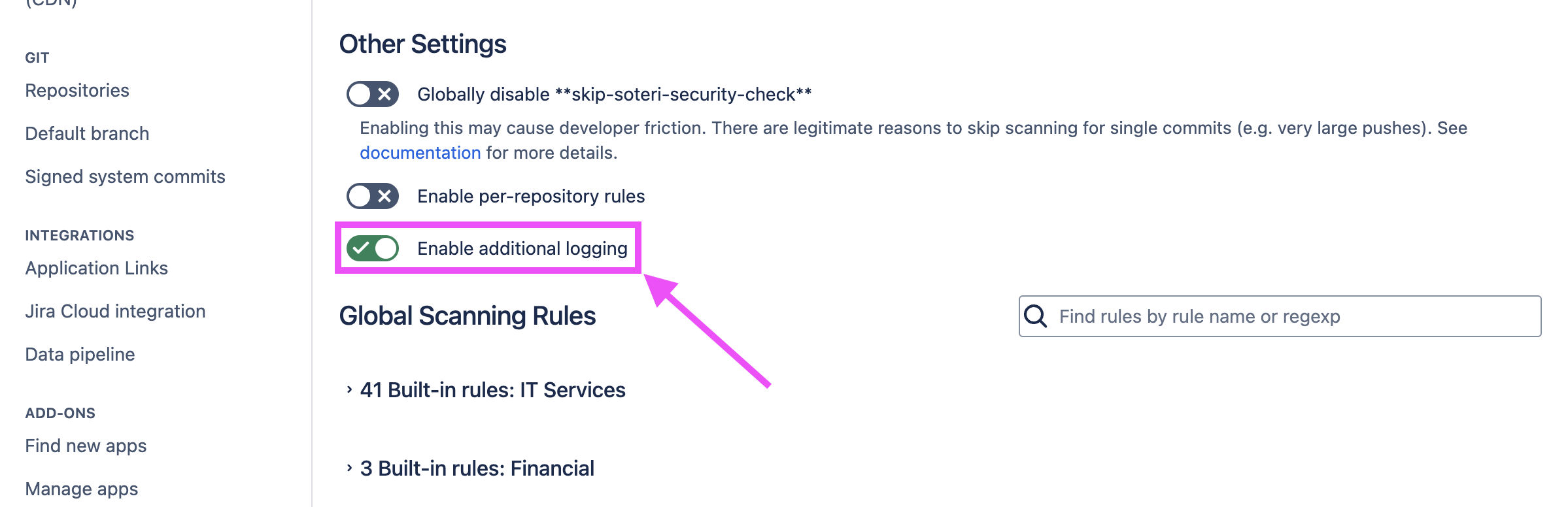 Bitbucket allows more granular configuration of logging. Soteri recommends using the “Enable additional logging” setting to troubleshoot any issue with Security for Bitbucket. However, if for any reason you decide to use the Bitbucket logging configuration, it will not conflict with the Additional Logging Setting.