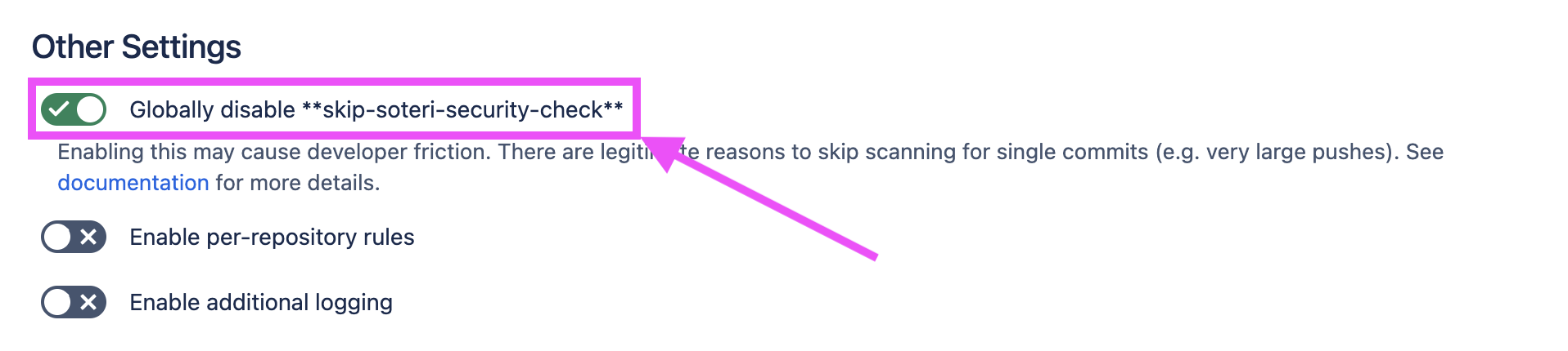 Enabling this option may cause developer friction. There are legitimate reasons to skip scanning for single commits, and Soteri does not recommend turning this on without having a process to turn it off to allow for edge cases.