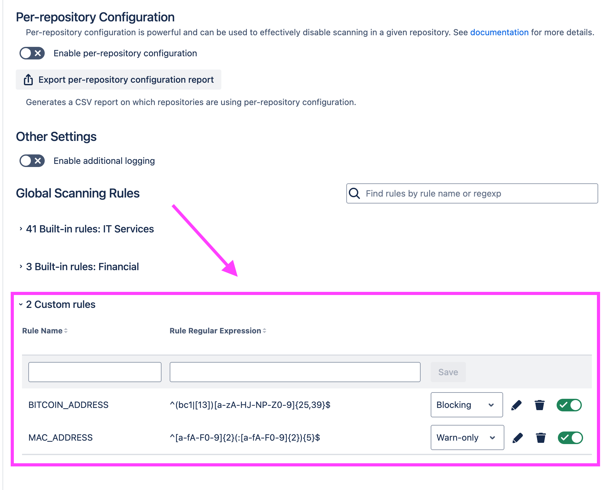 Security for Bitbucket allows for creation of custom scanning rules using regular expressions. The rules can only be created, enabled, or disabled by Bitbucket Administrators or anyone that's been granted explicit access.