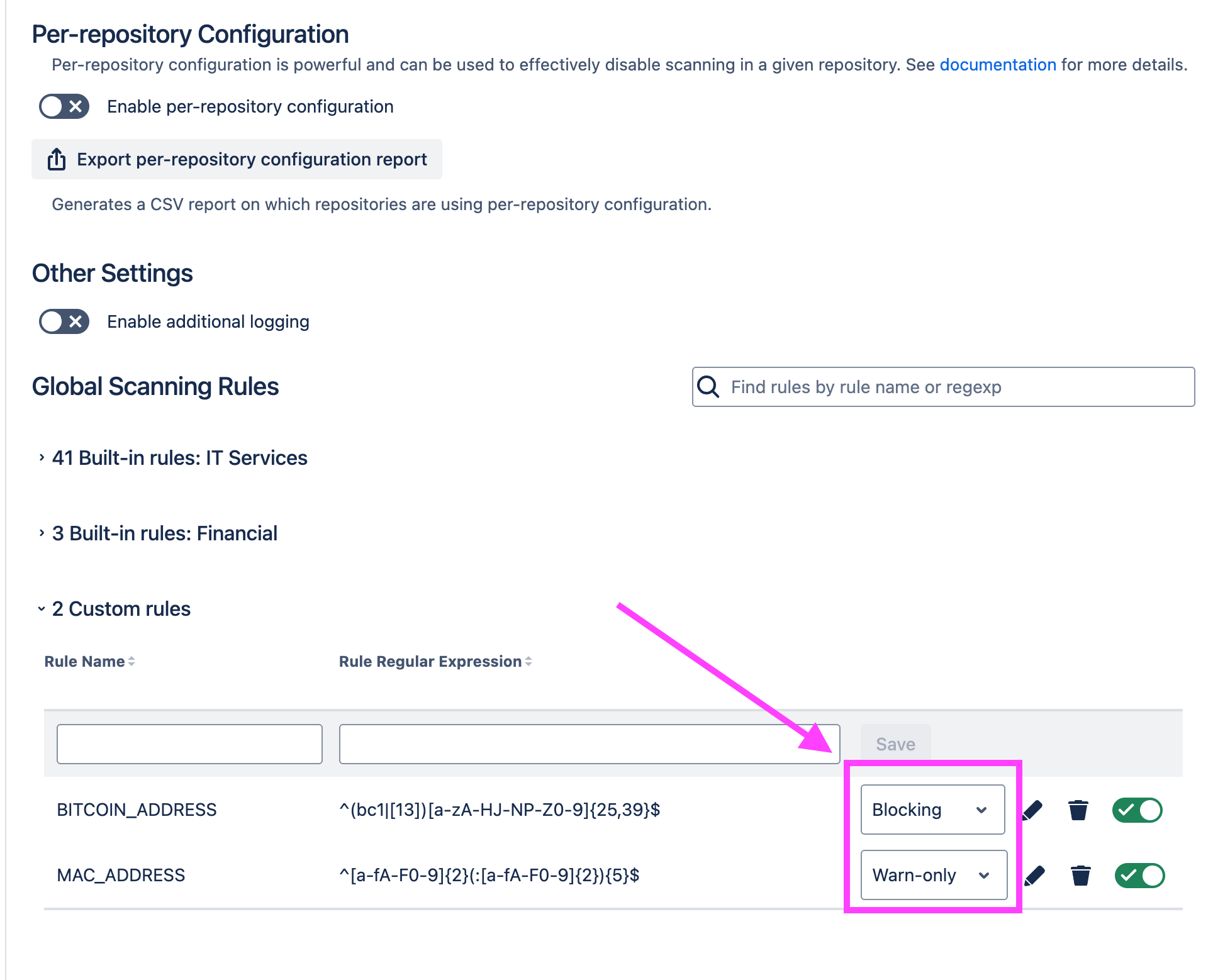 In the example above, the “Bitcoin Address” rule is configured to be blocking, and the “MAC Address” rule is configured to be warn-only. This leads to the following behavior when a commit that contains these findings is pushed: