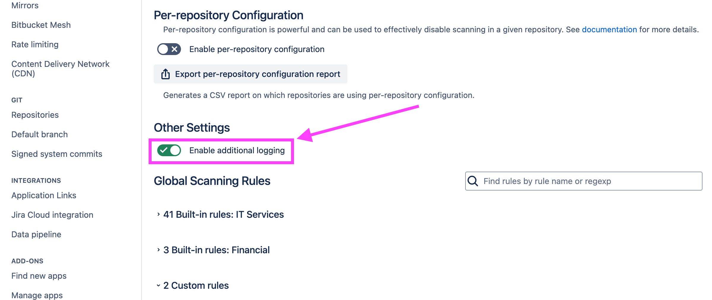 Bitbucket allows more granular configuration of logging. Soteri recommends using the “Enable additional logging” setting to troubleshoot any issue with Security for Bitbucket. However, if for any reason you decide to use the Bitbucket logging configuration, it will not conflict with the Additional Logging Setting.