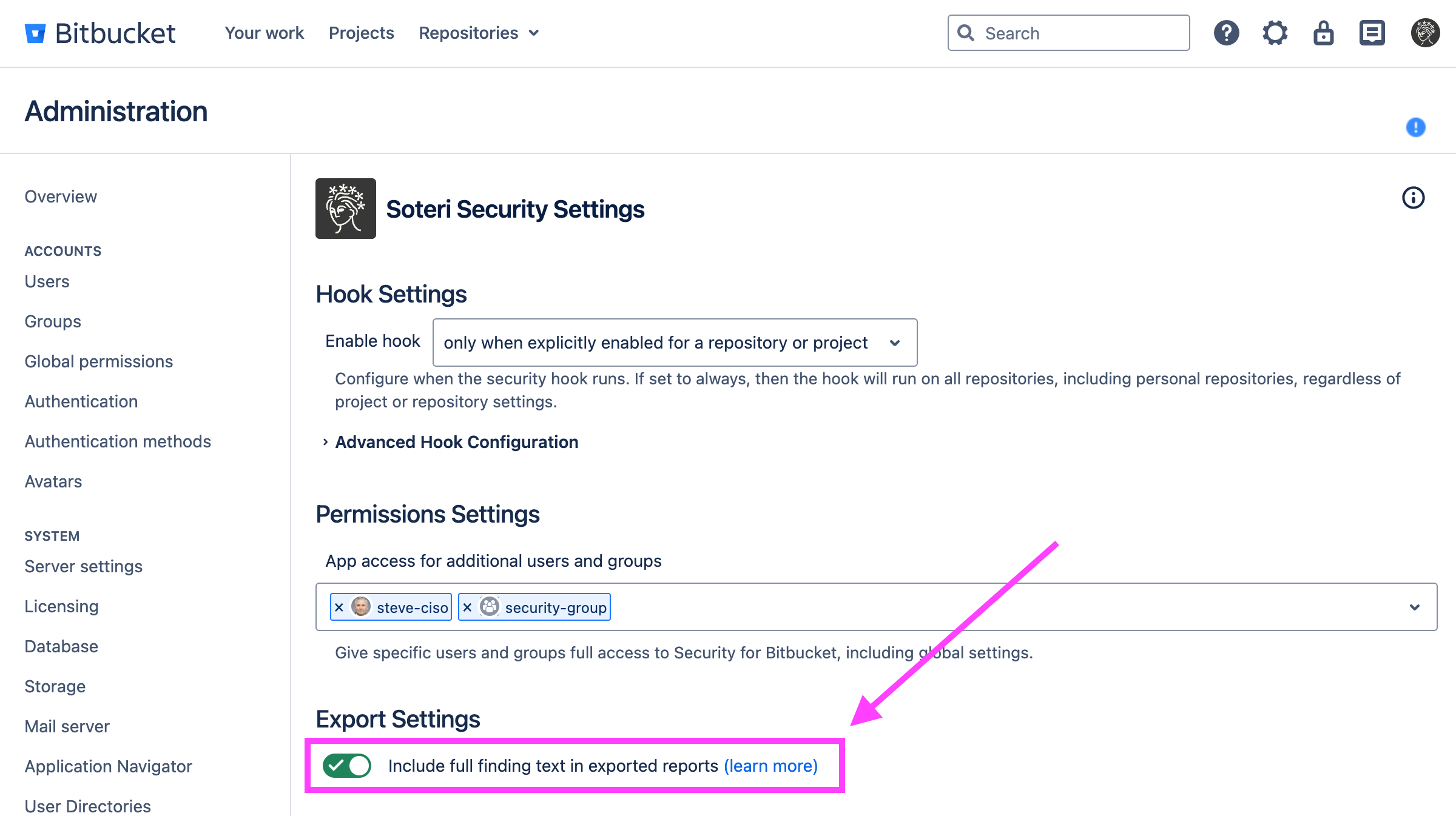 You may also use various REST calls to export findings of any given branch, repository, project, or the whole Bitbucket instance.