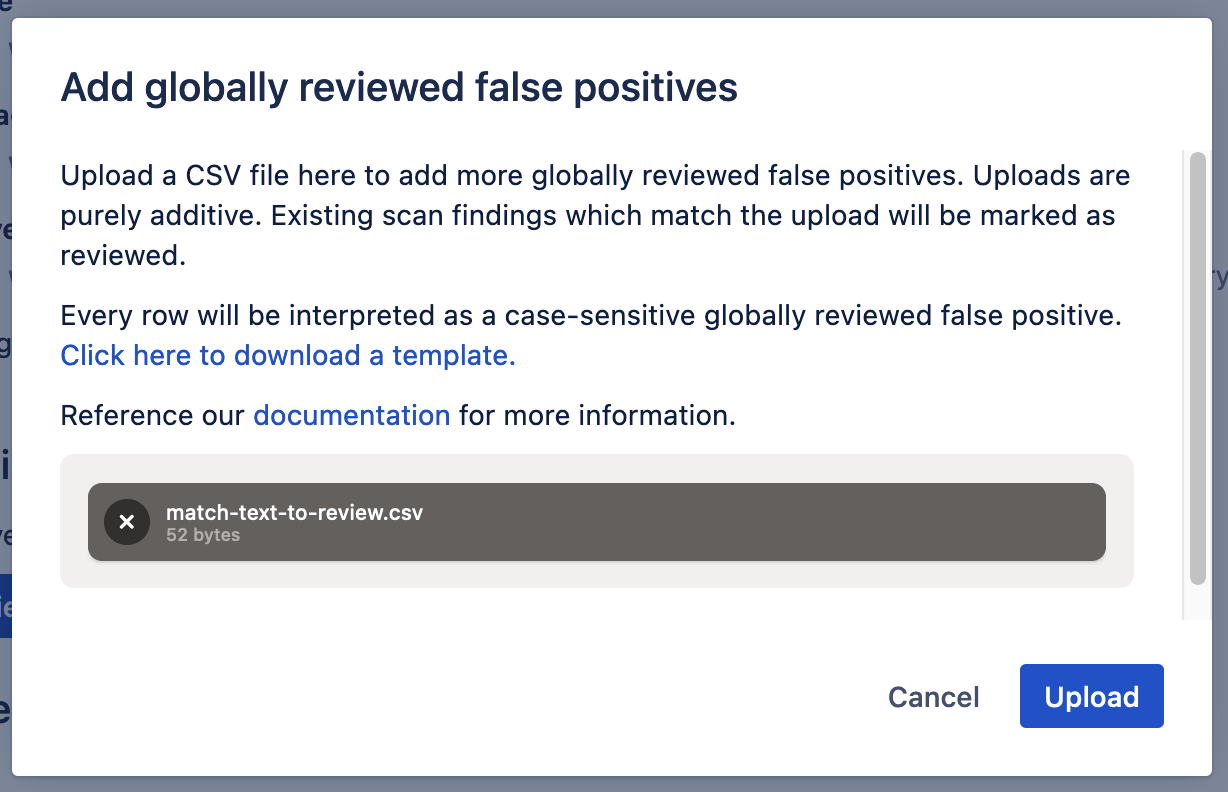 Upload it on the settings page using the “Add reviewed” button under the “Globally Review Findings” heading.