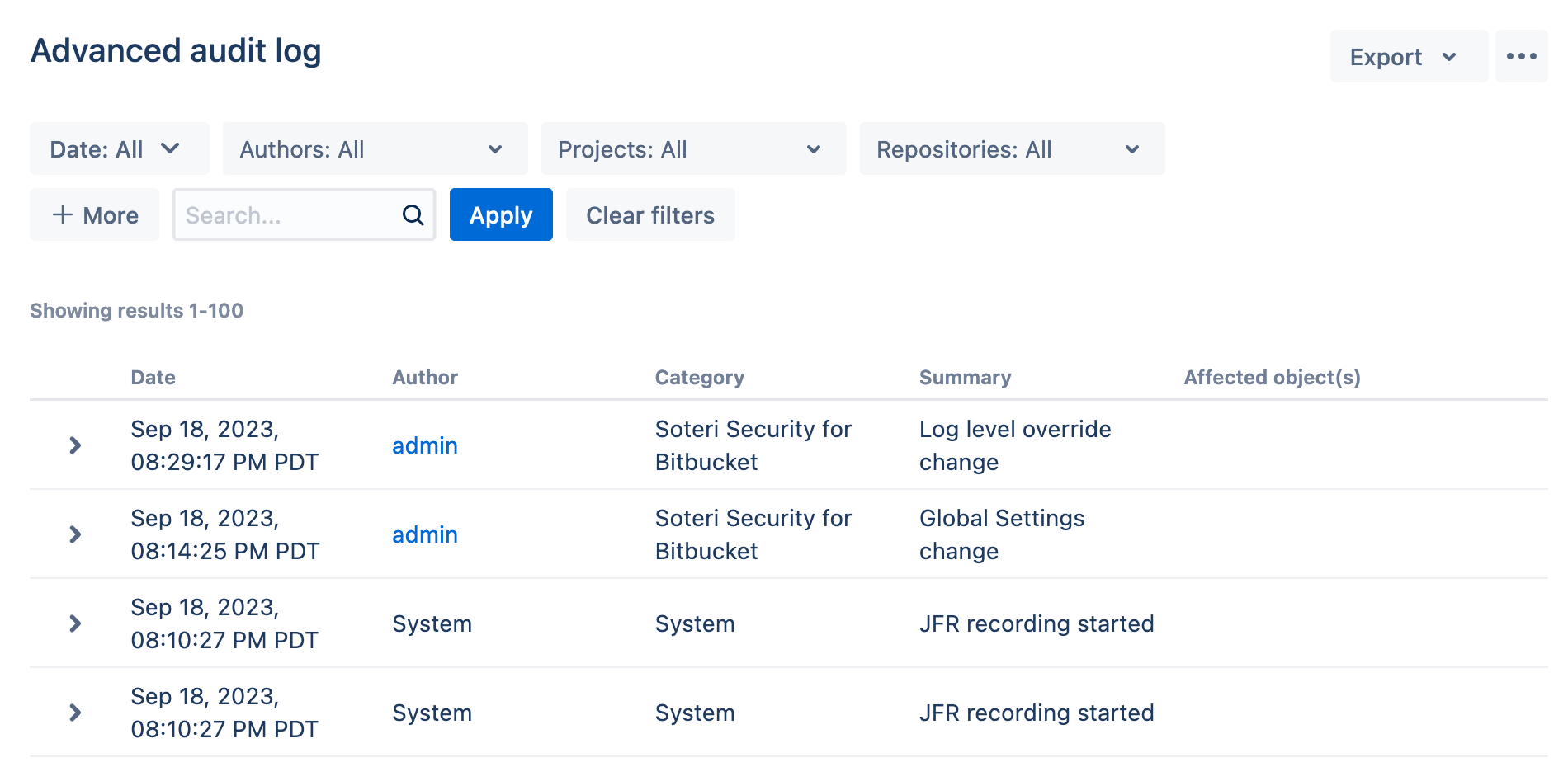 To help administrators keep track of various events, Security for Bitbucket places certain entries in Bitbucket’s Audit Log.