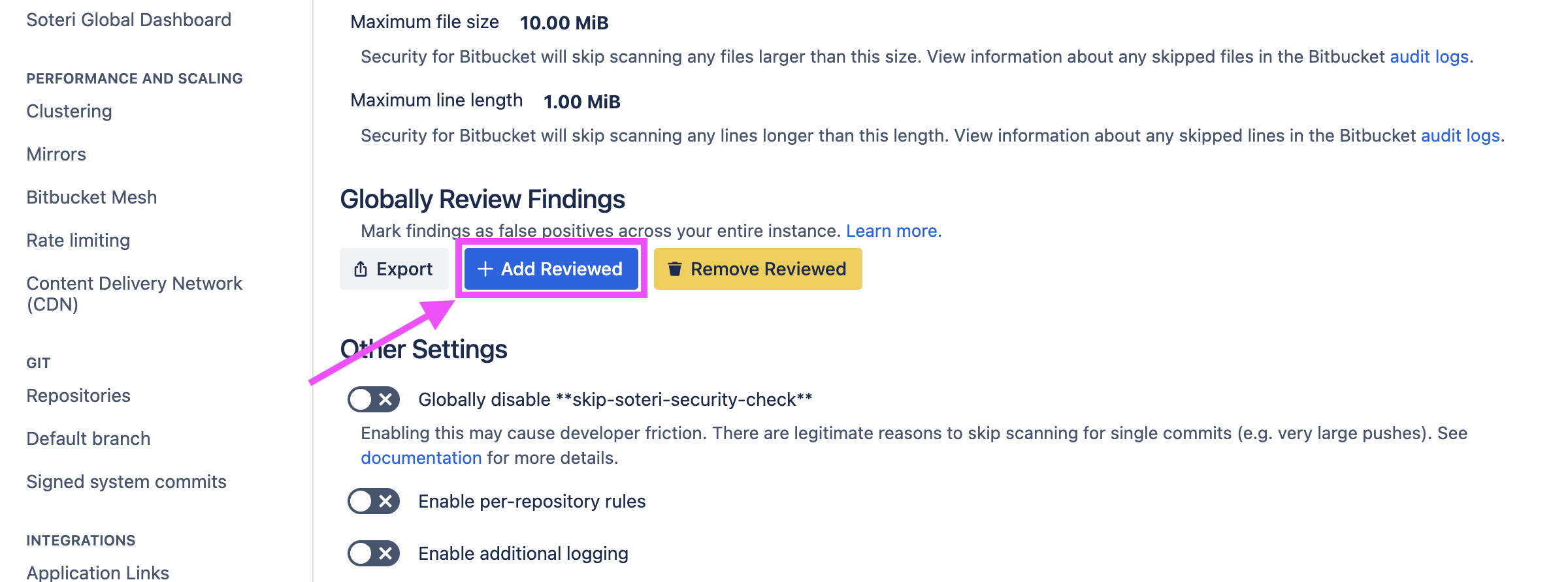 Navigate to the settings page. Then, click on the “Add Reviewed” button under “Globally Review Findings”: