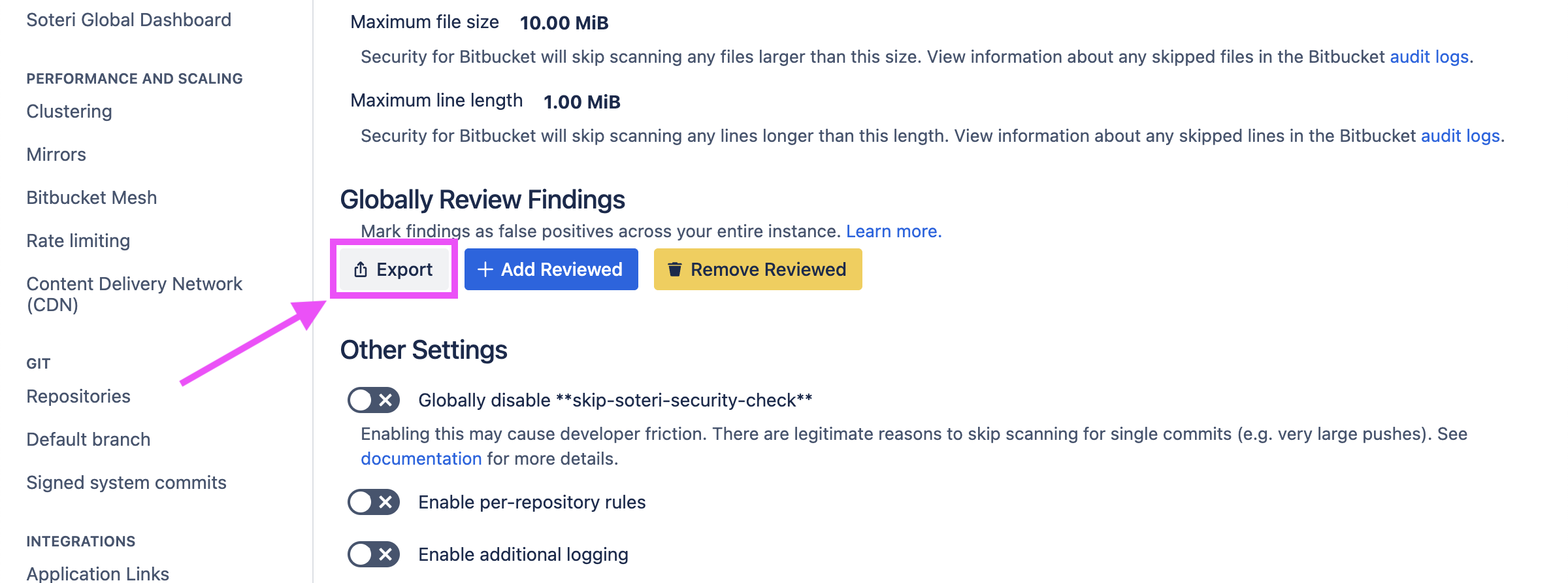Navigate to the settings page. Then, click on the “Export” button under “Globally Review Findings”: