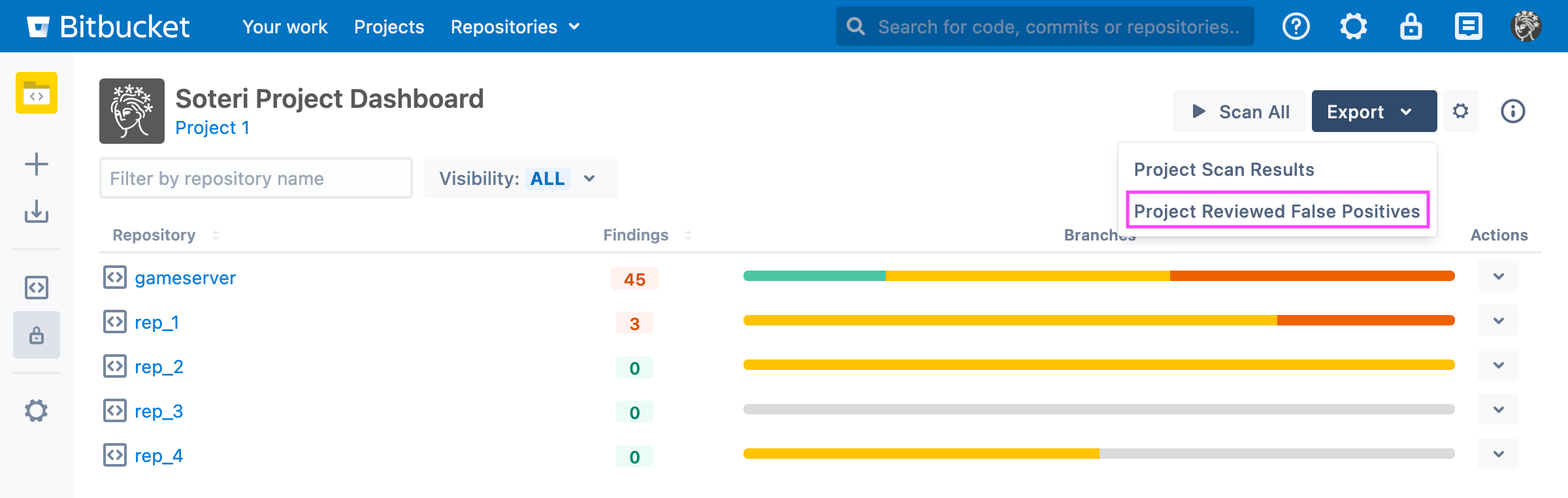 Bitbucket users with repository-write permissions can review findings from the Security Analysis. Findings reviewed this way are scoped to the repository the finding is in.