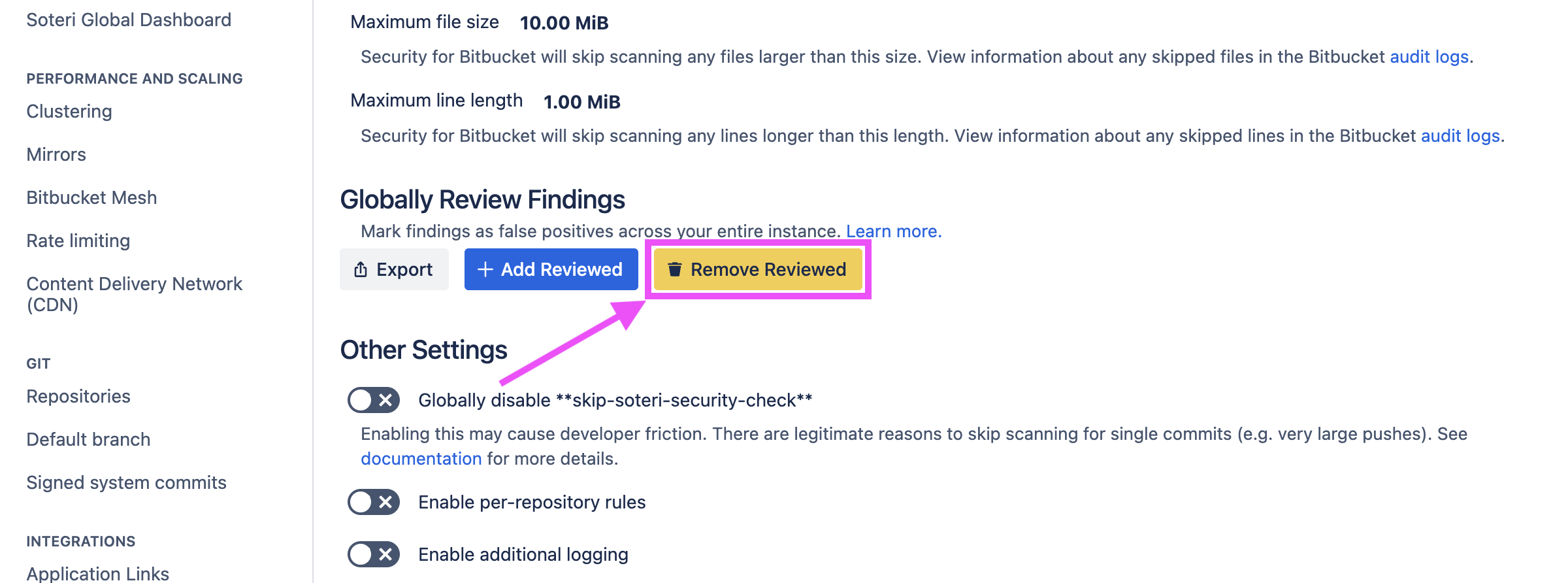Bitbucket administrators and anyone granted explicit access can review findings globally, on the Soteri Security Settings page.