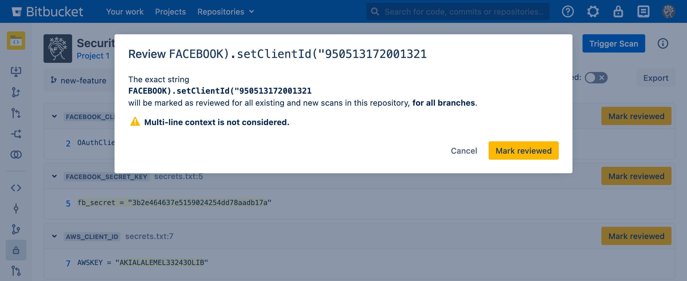 Sometimes, Security for Bitbucket will identify findings which are false positives, credentials which have already been revoked, etc. If this happens, you can review the finding. This marks the finding, as well as any other findings which exactly match it, as reviewed in the current and future scans.