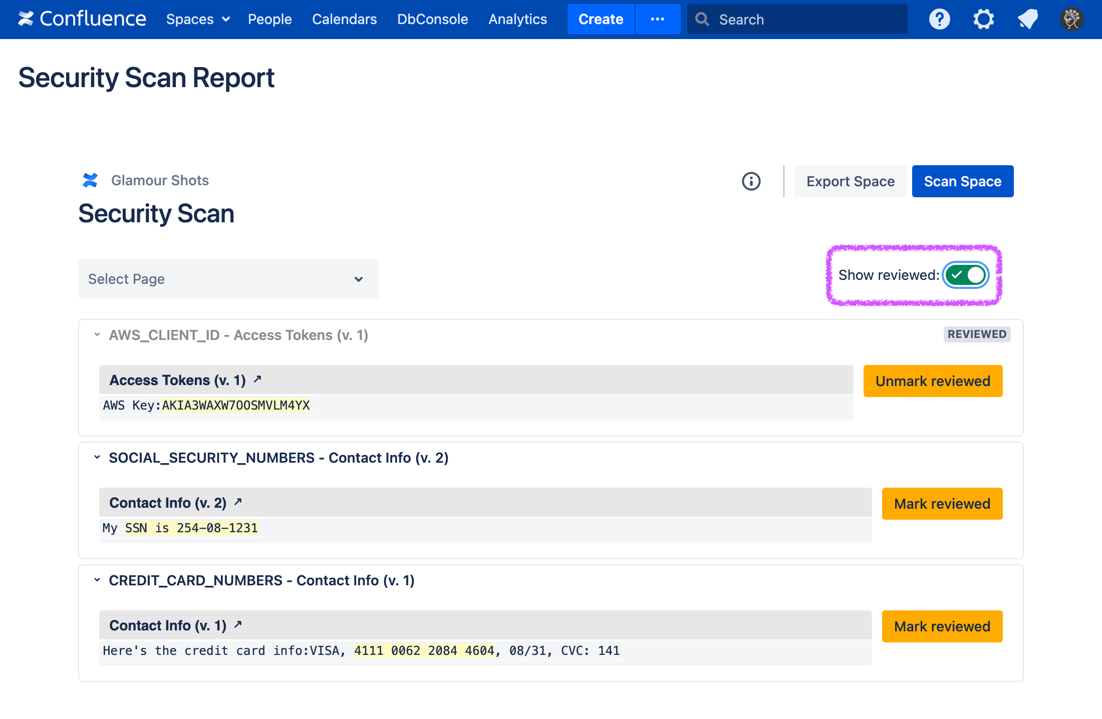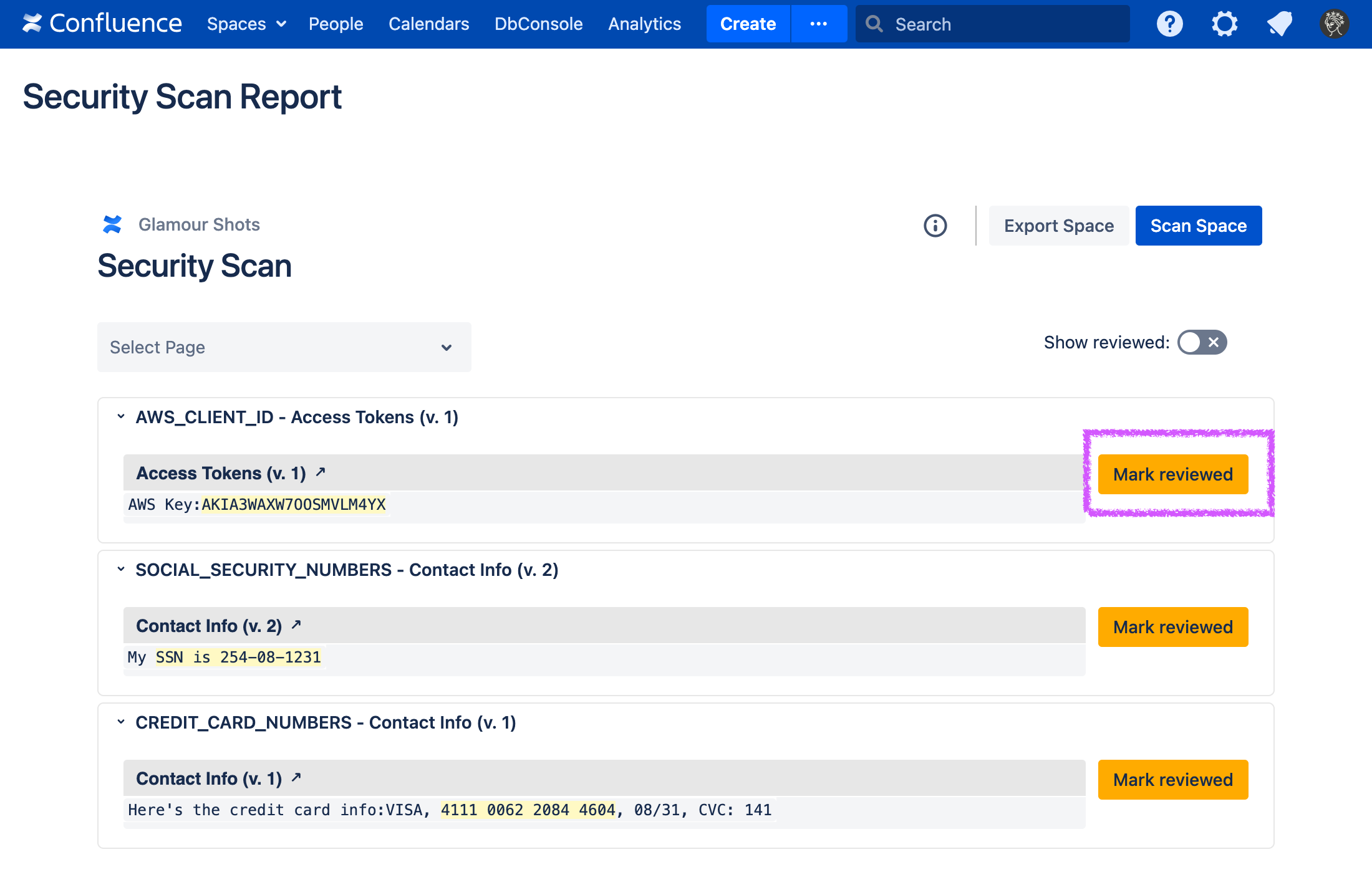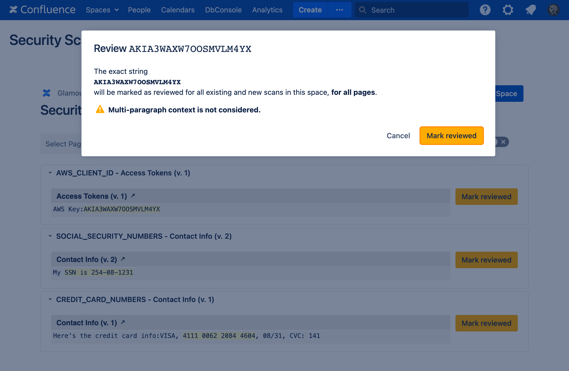 Sometimes, Security for Confluence will find false positives, credentials which have already been revoked, etc. If this happens, you can review the finding. This marks the finding, as well as any other findings which exactly match it, as reviewed in the current and future scans.
