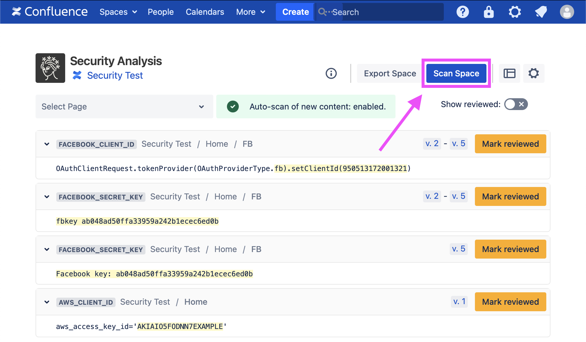 From the Security Analysis page, you can view and disposition scan findings for that particular space, including hiding false positives. You may also trigger a scan using the “Scan Space” button: