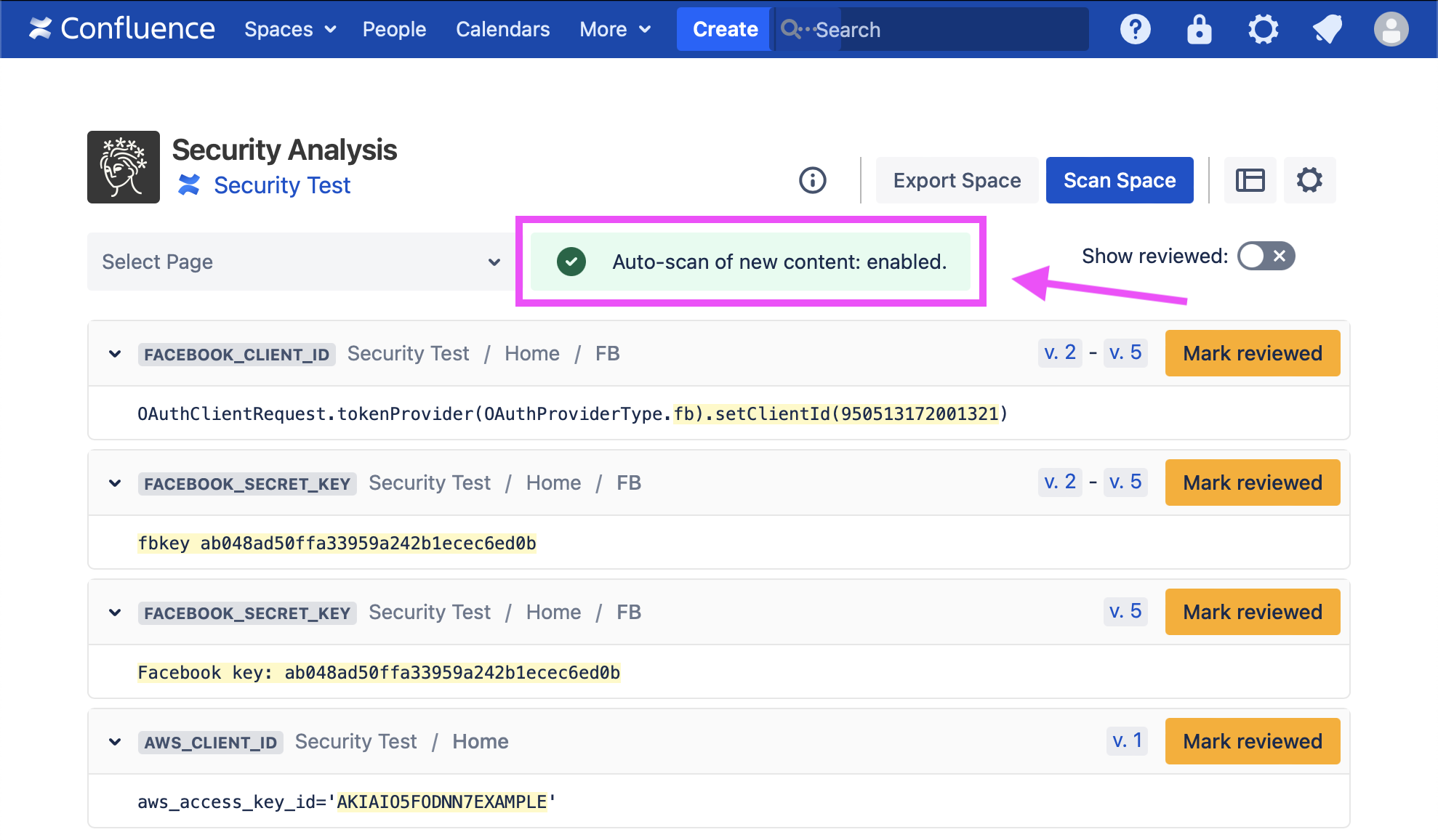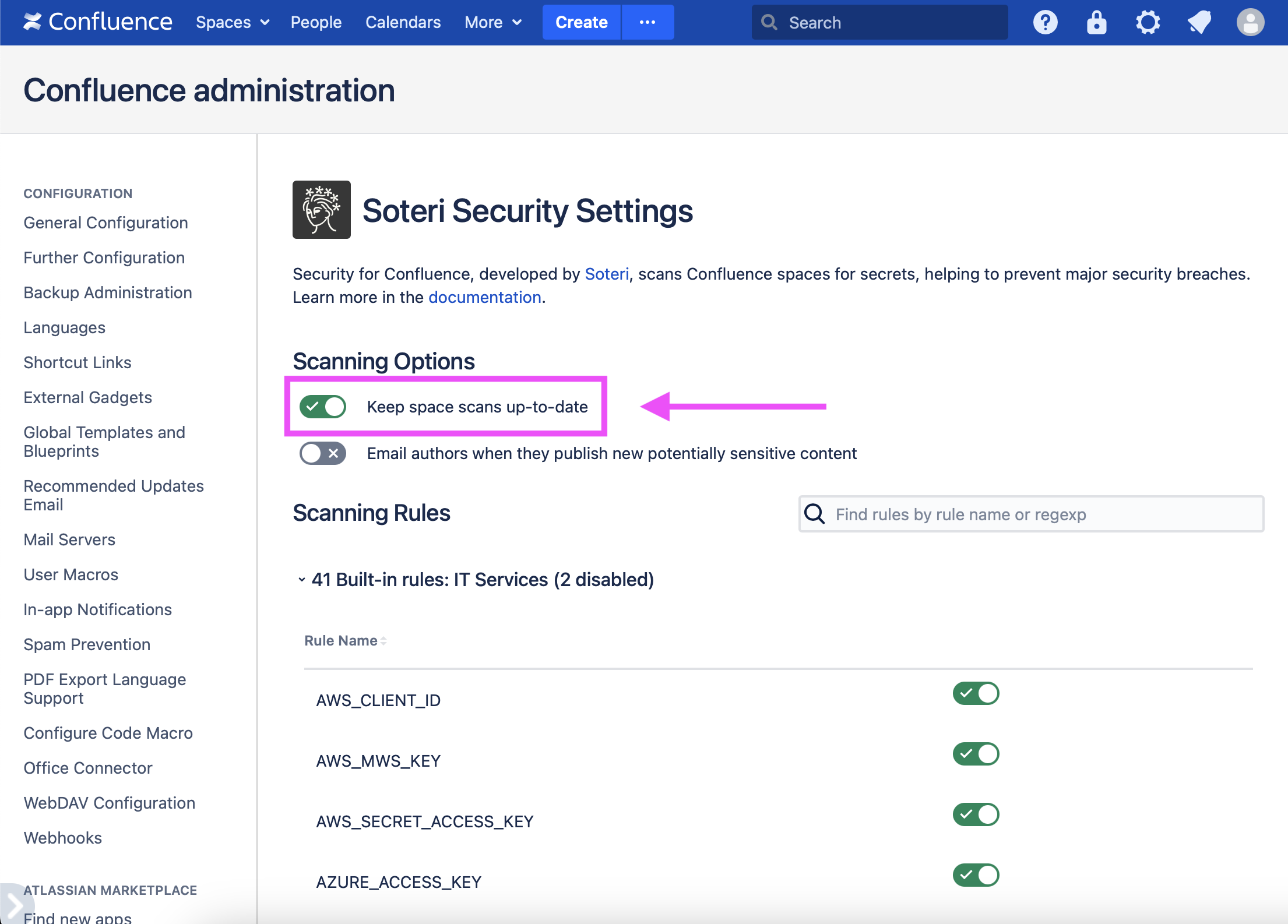 By default, Security for Confluence will automatically scan newly created spaces and imported spaces. Also, for existing spaces which have been scanned at least once, Security for Confluence will automatically scan new and updated content.