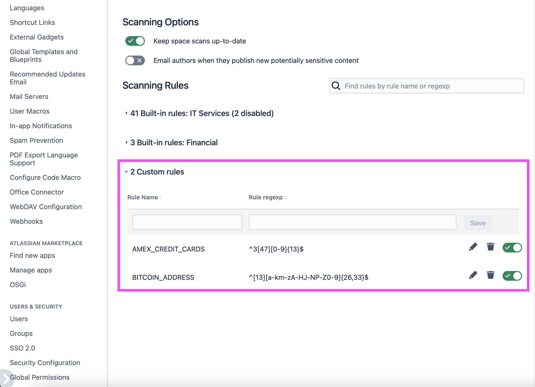 Security for Confluence allows you to create custom scanning rules using regular expressions. You can create and edit custom rules from the Settings page, under “Custom rules”: