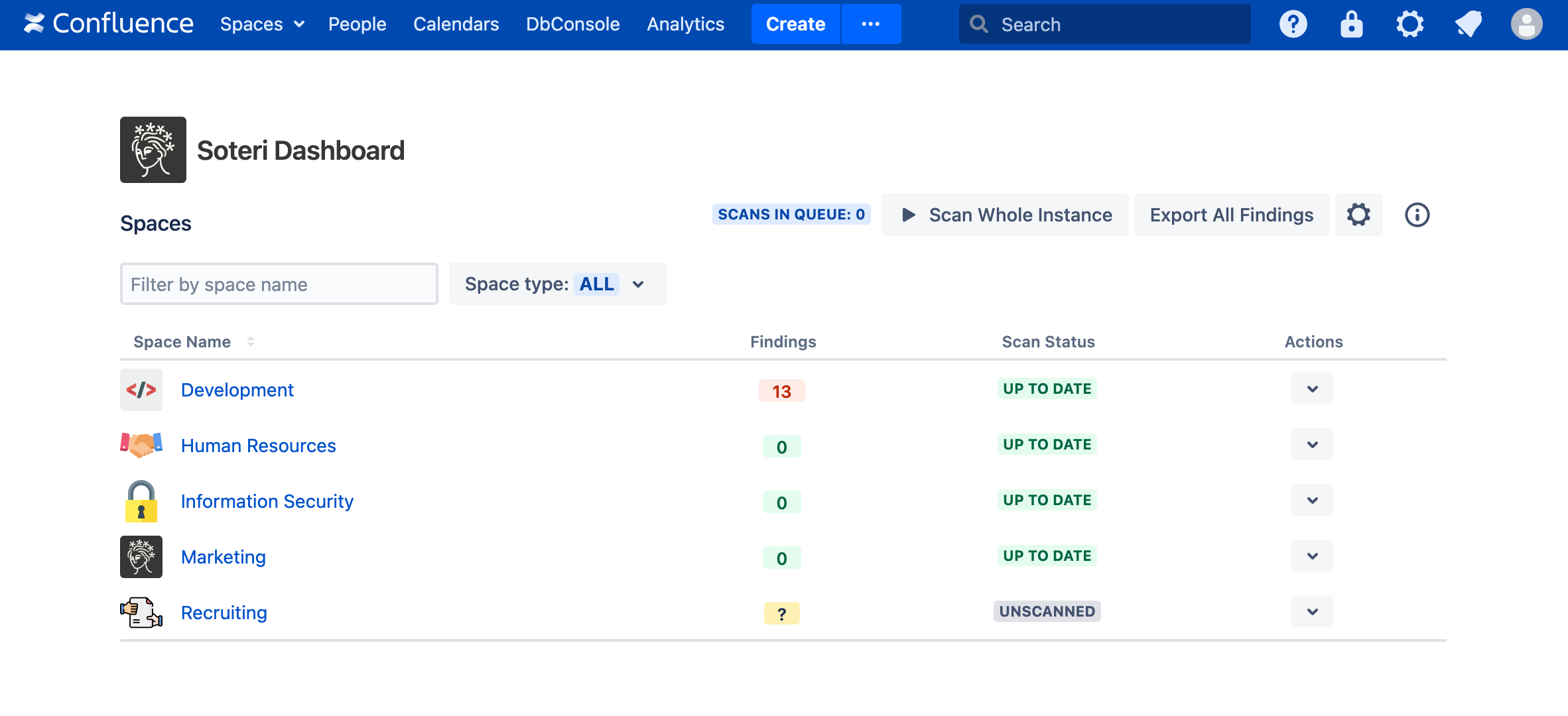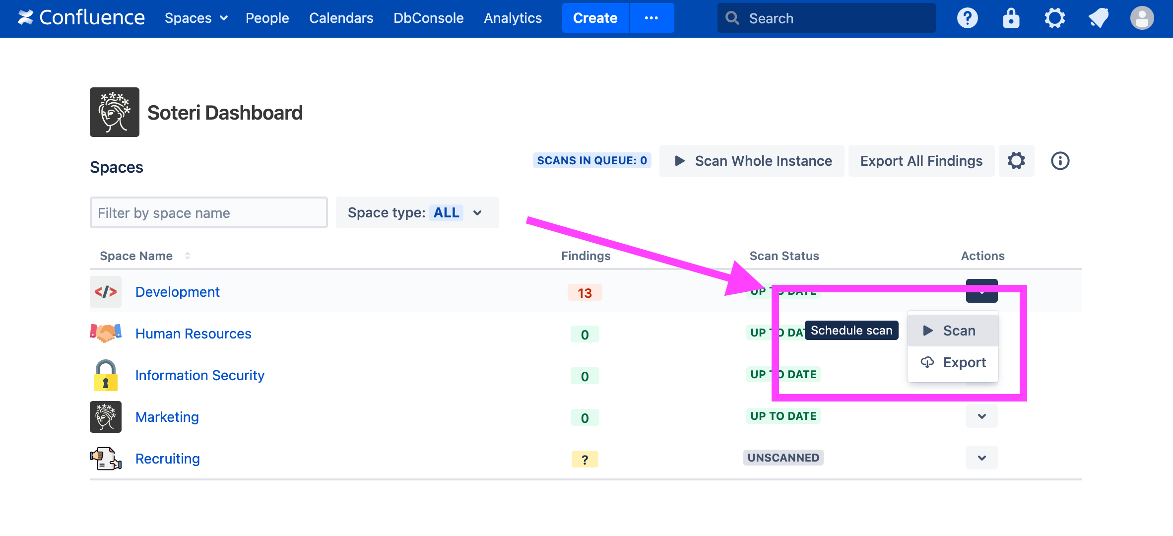 Choosing “Scan” will trigger a scan for new and modified pages in that space. Choosing “Export” will download a list of all findings for that space in CSV format. Read more about exports here.