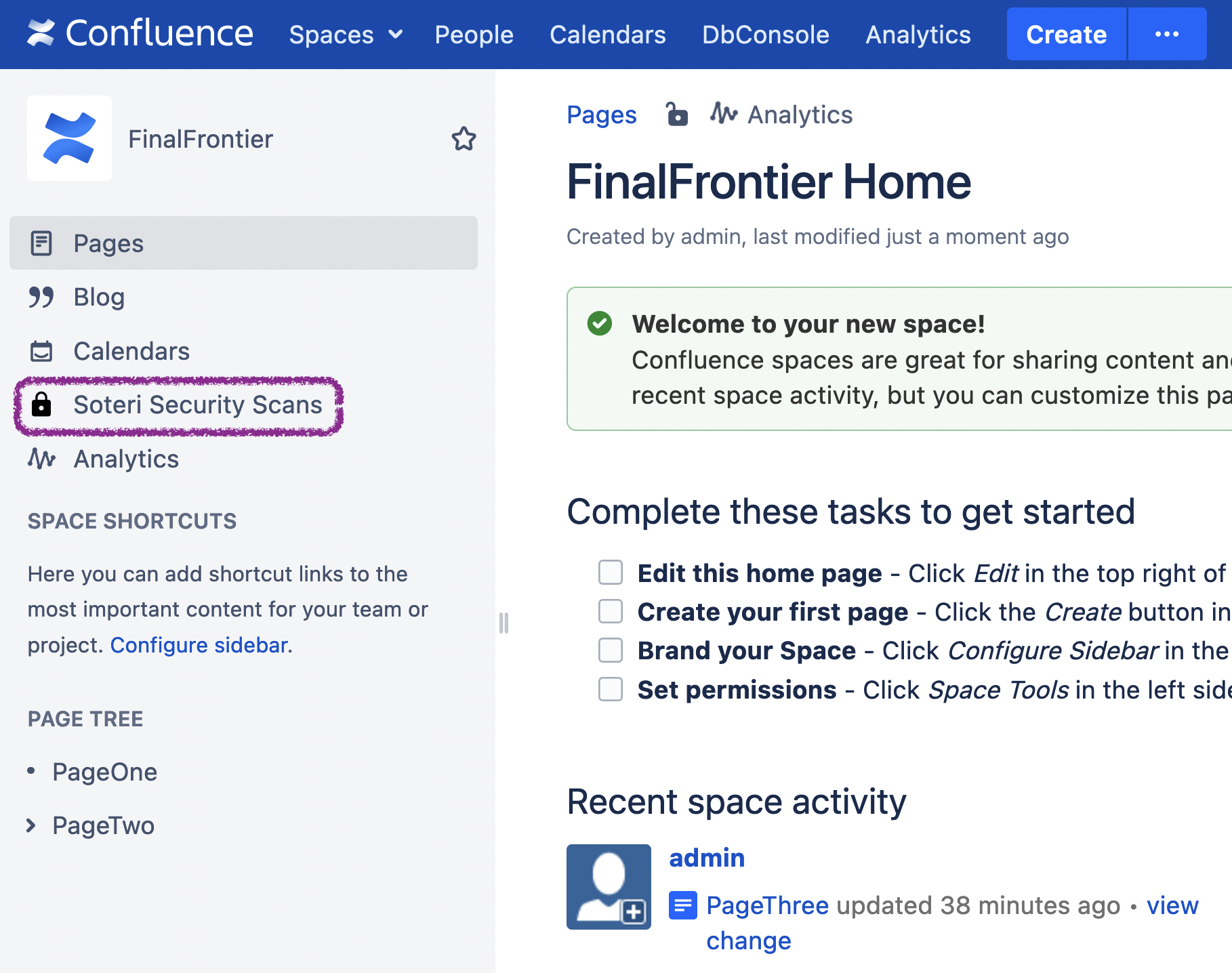 To view and trigger security scans, if you are not a Confluence administrator, you will need Space administration permissions. Navigate to your space of choice, and then go to the Soteri Security Scans tab.