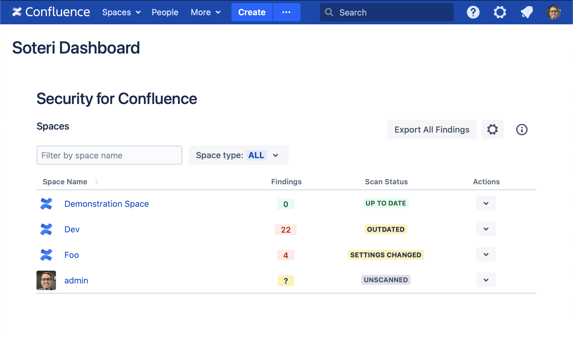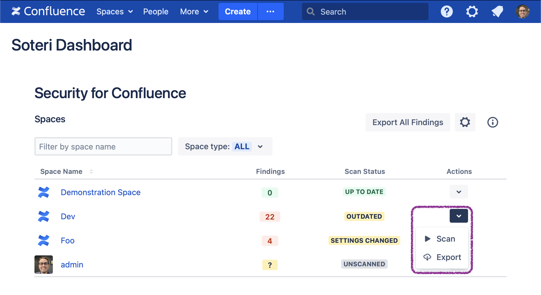 The Soteri Dashboard allows users to view the scan statuses of all Confluence spaces they can administer. It can be accessed from the Confluence’s “Spaces” menu: