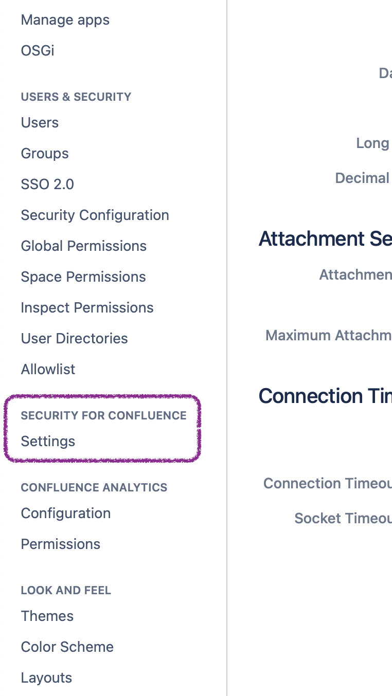 and then selecting “Settings” under “Security for Confluence” in the left side of the window: