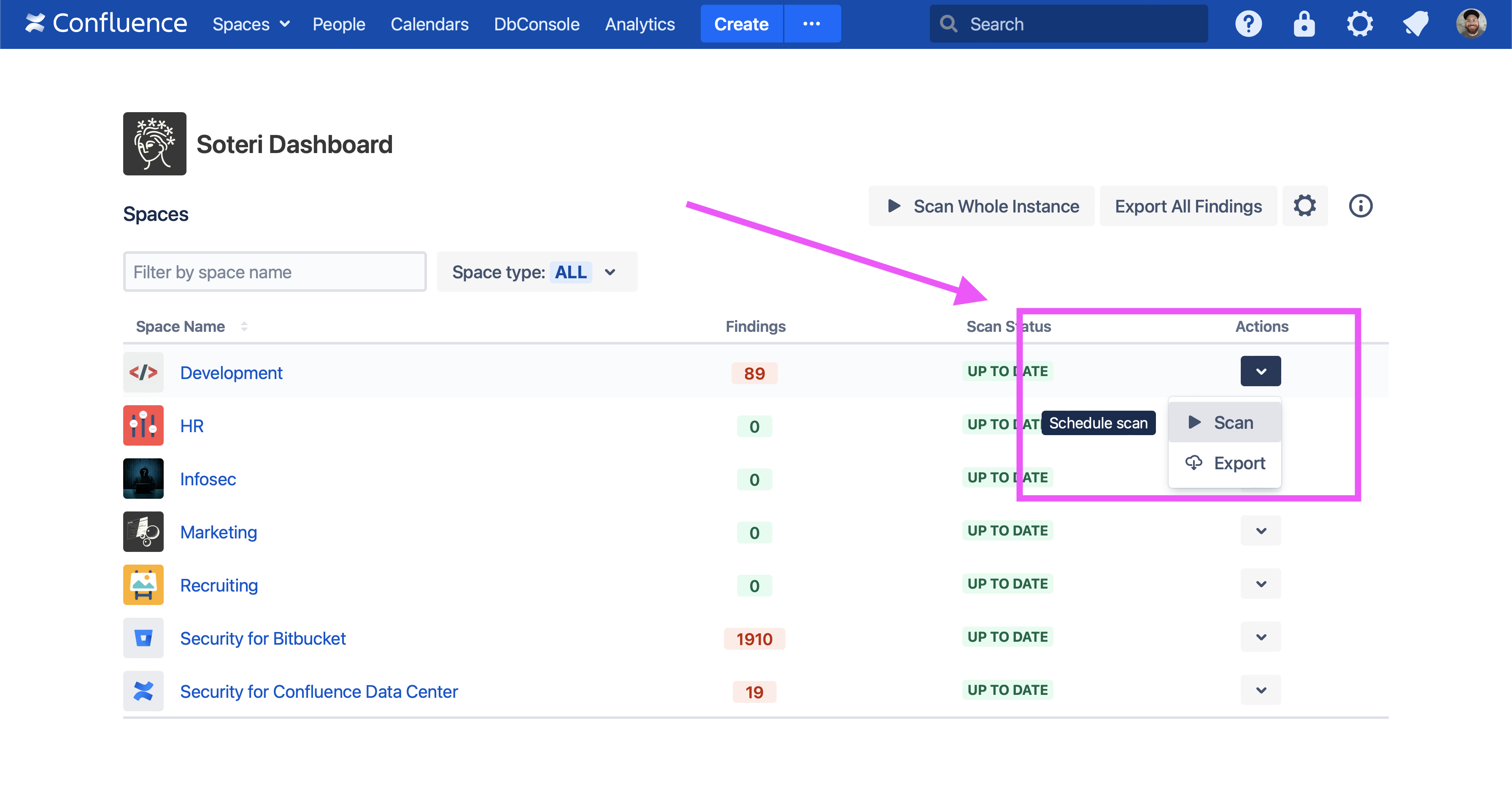 Scans may be triggered for spaces individually or, if you are a Confluence administrator, all at once. The easiest way to do either is via the Soteri Dashboard, which contains all spaces for which you have administration privileges.