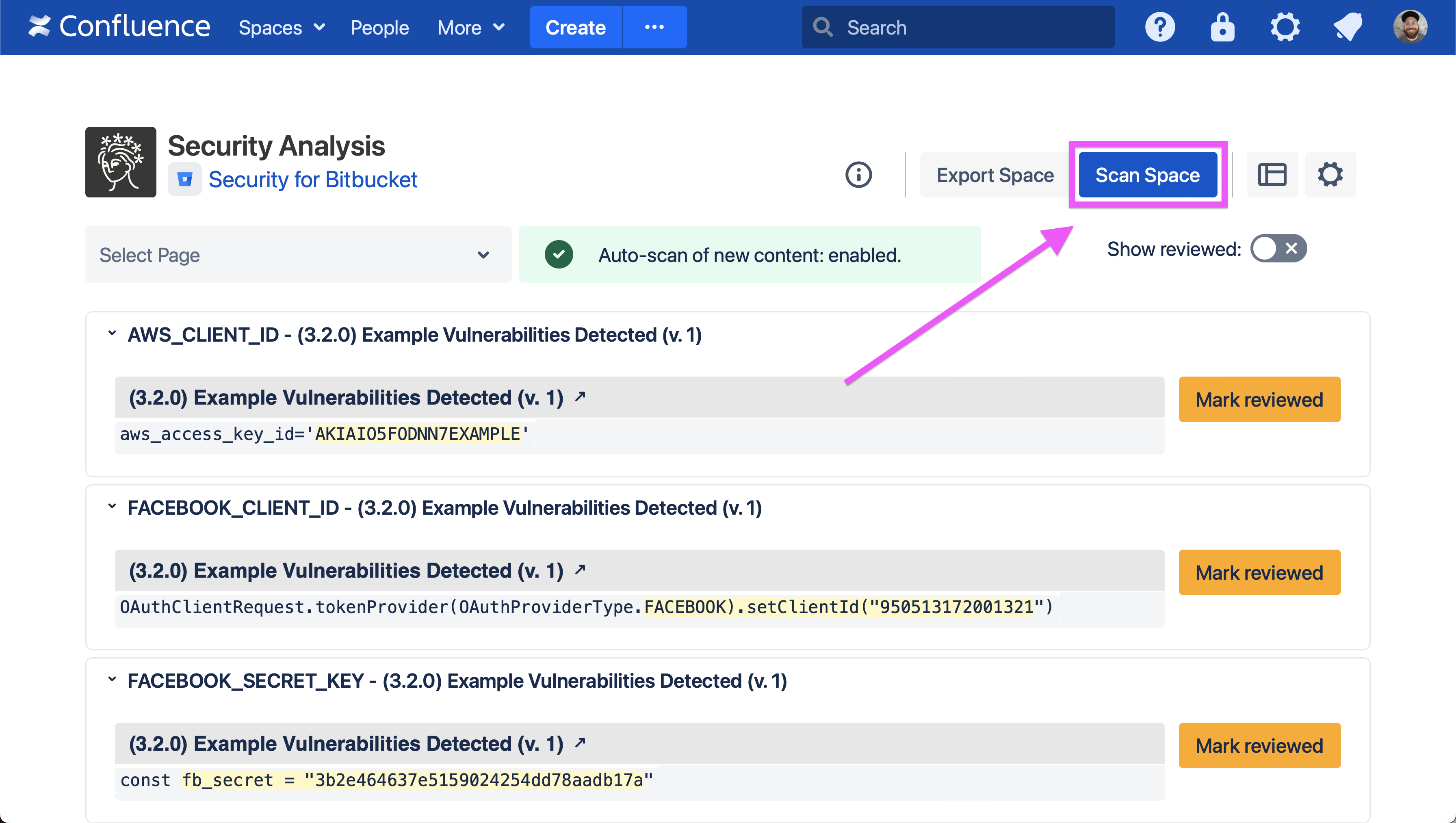 From the Security Analysis page, you can view and disposition scan findings for that particular space, including hiding false positives. You may also trigger a scan using the “Scan Space” button.