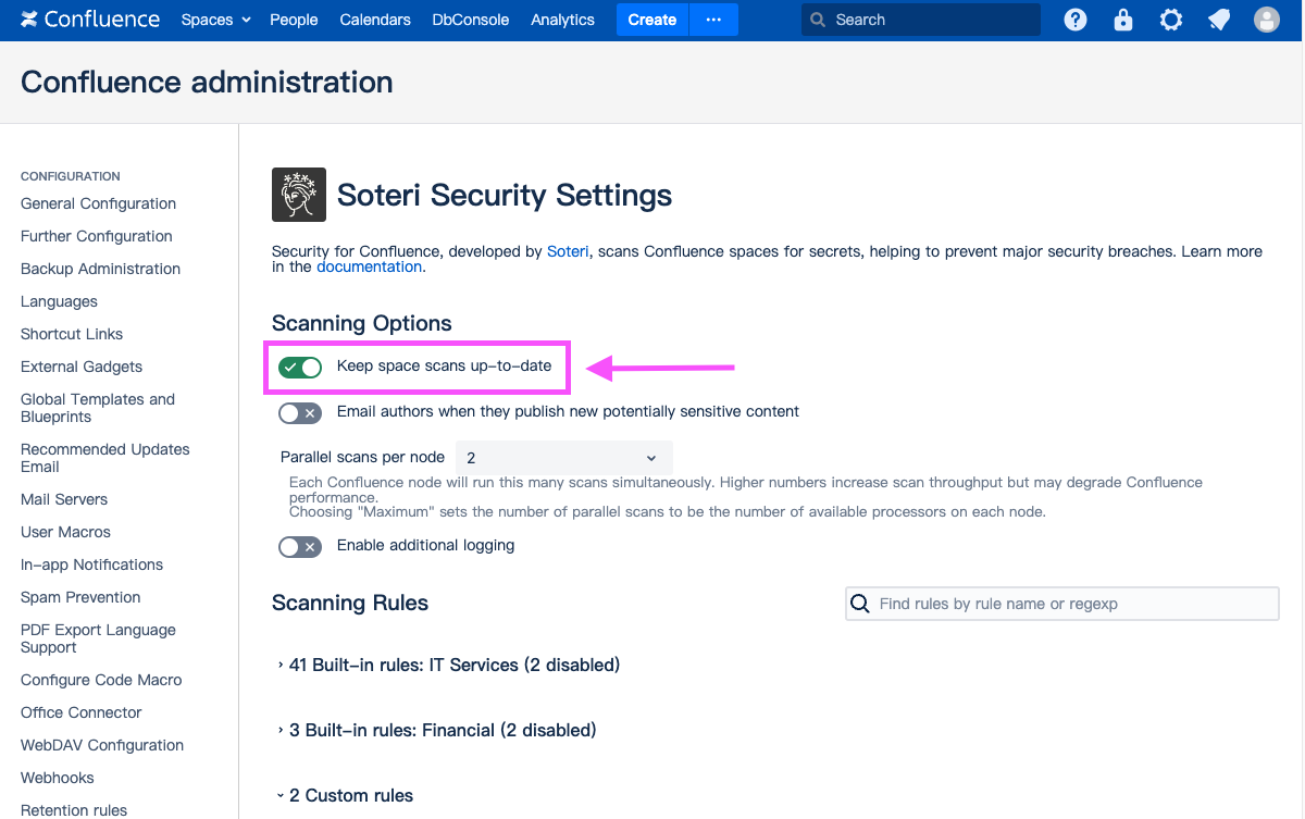 By default, Security for Confluence will automatically scan newly created spaces and imported spaces. Also, for existing spaces which have been scanned at least once, Security for Confluence will automatically scan new and updated content.