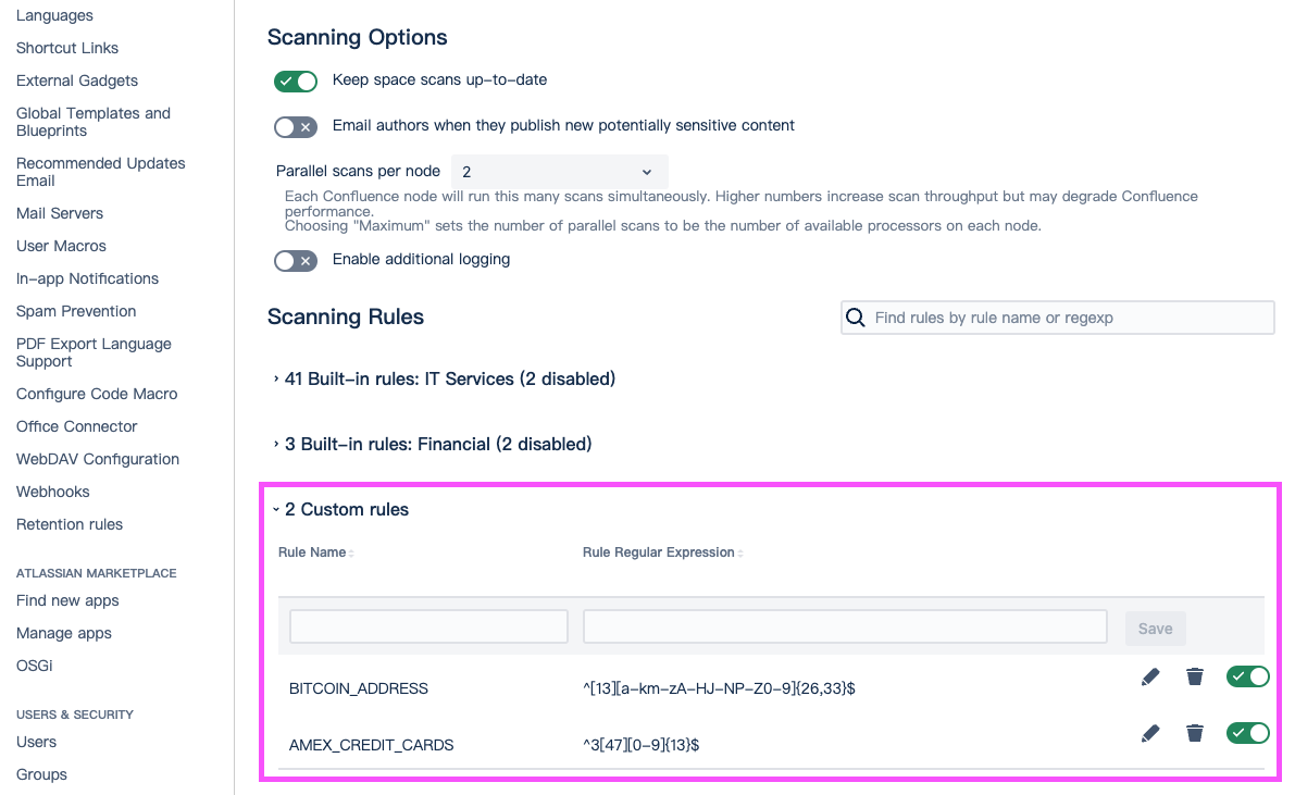Security for Confluence allows you to create custom scanning rules using regular expressions. You can create and edit custom rules from the Settings page, under “Custom rules”: