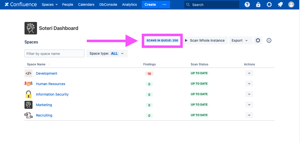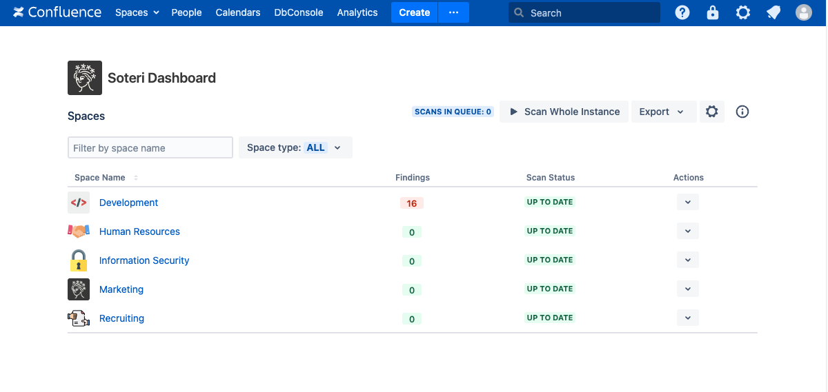 Choosing “Scan” will trigger a scan for new and modified pages in that space. Choosing “Export” will download a list of all findings for that space in CSV format. Read more about exports here.